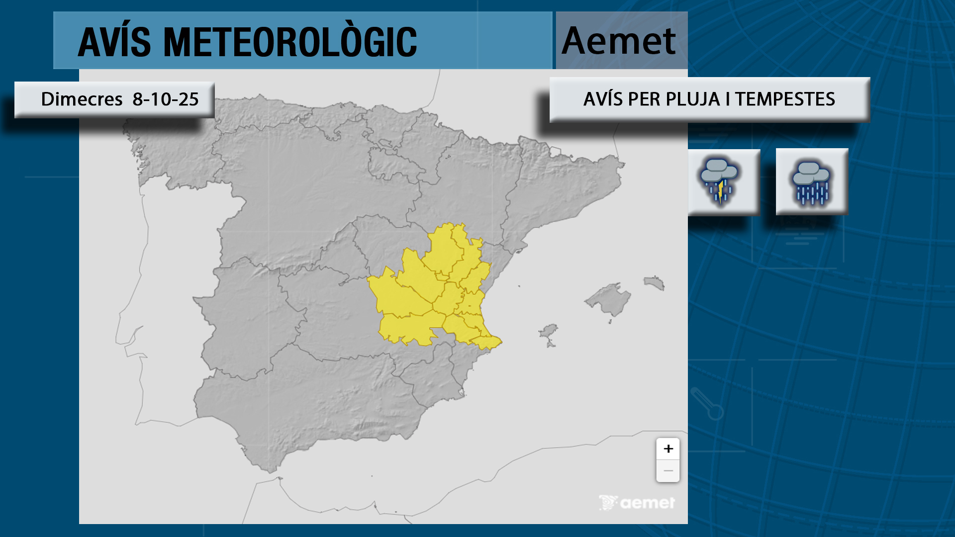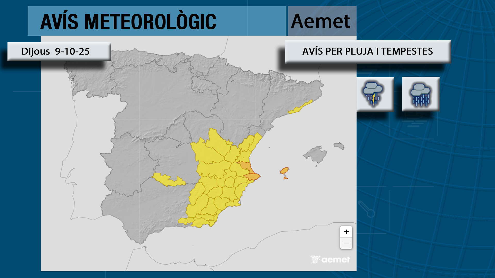 És la zona on més caldrà estar atents. L’Aemet ha activat l’avís taronja per pluges intenses i persistents al litoral i prelitoral. Els ruixats s’iniciaran a la vesprada i s’intensificaran a la nit, amb acumulats que podrien superar els 80 litres per metre quadrat en 12 hores. Demà dijous, 9 d’Octubre, el temps serà molt advers, amb risc de tempestes fortes, mala mar i descens tèrmic notable.