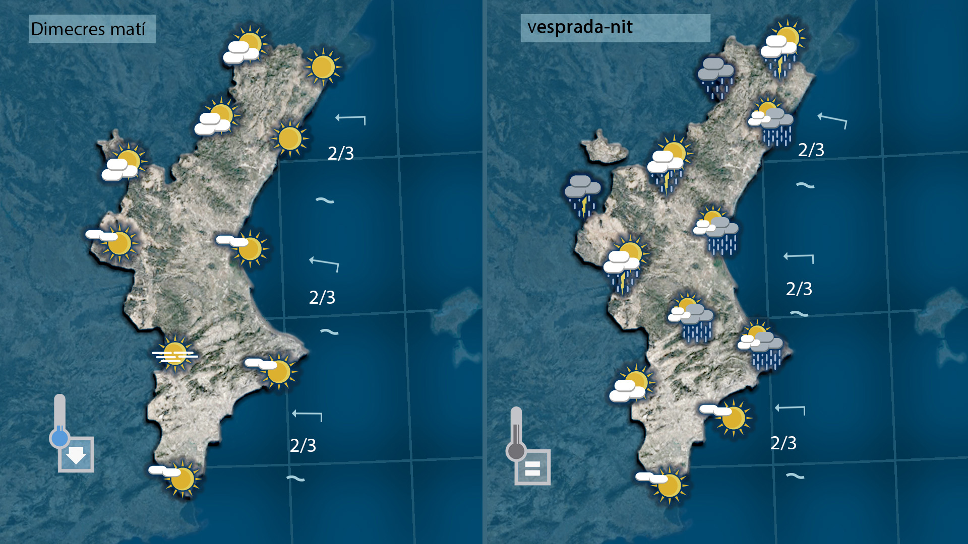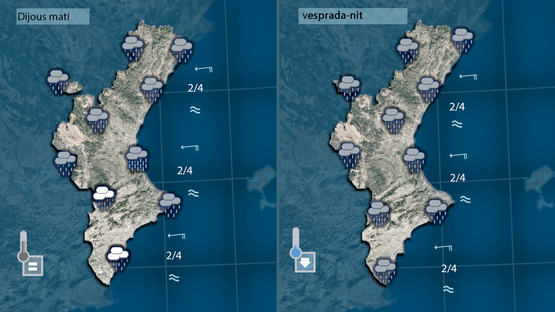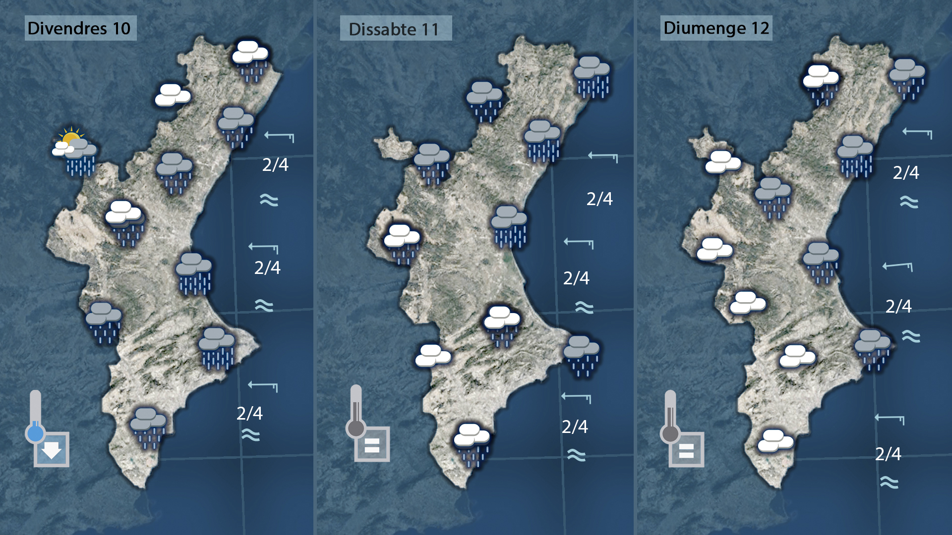El matí encara serà estable i amb intervals de sol, però a partir de la vesprada arribaran ruixats i tronades que es faran generals a la nit. L’avís taronja també s’ha activat a la Marina Alta i el Comtat, on les pluges podran ser intenses i persistents. A mesura que avance el cap de setmana, el vent de llevant afavorirà pluges més abundants al litoral, amb un ambient humit i temperatures màximes d’entre 22 i 24 graus.