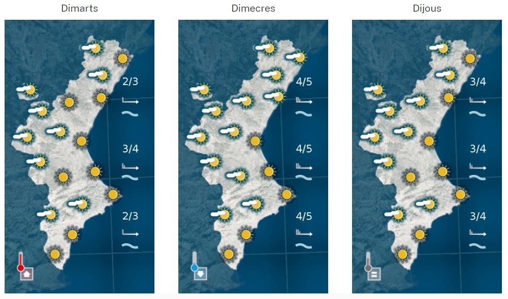 Més al sud, el ponent ja s’ha deixat sentir des de la matinada, provocant un augment de les temperatures nocturnes. Hui, les màximes superaran els 24 graus en algunes zones. Demà, les temperatures es mantindran en valors similars, mentre que dijous es notarà un increment de la força del vent, sobretot a les comarques de l’Alacantí i el Vinalopó. A partir de divendres, el vent perdrà intensitat i el cap de setmana es presenta càlid i assolellat.