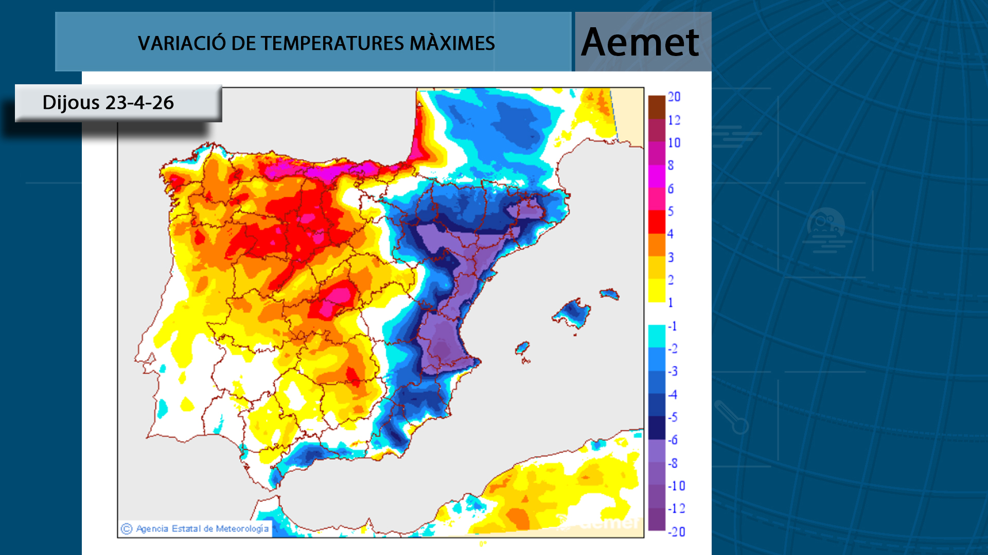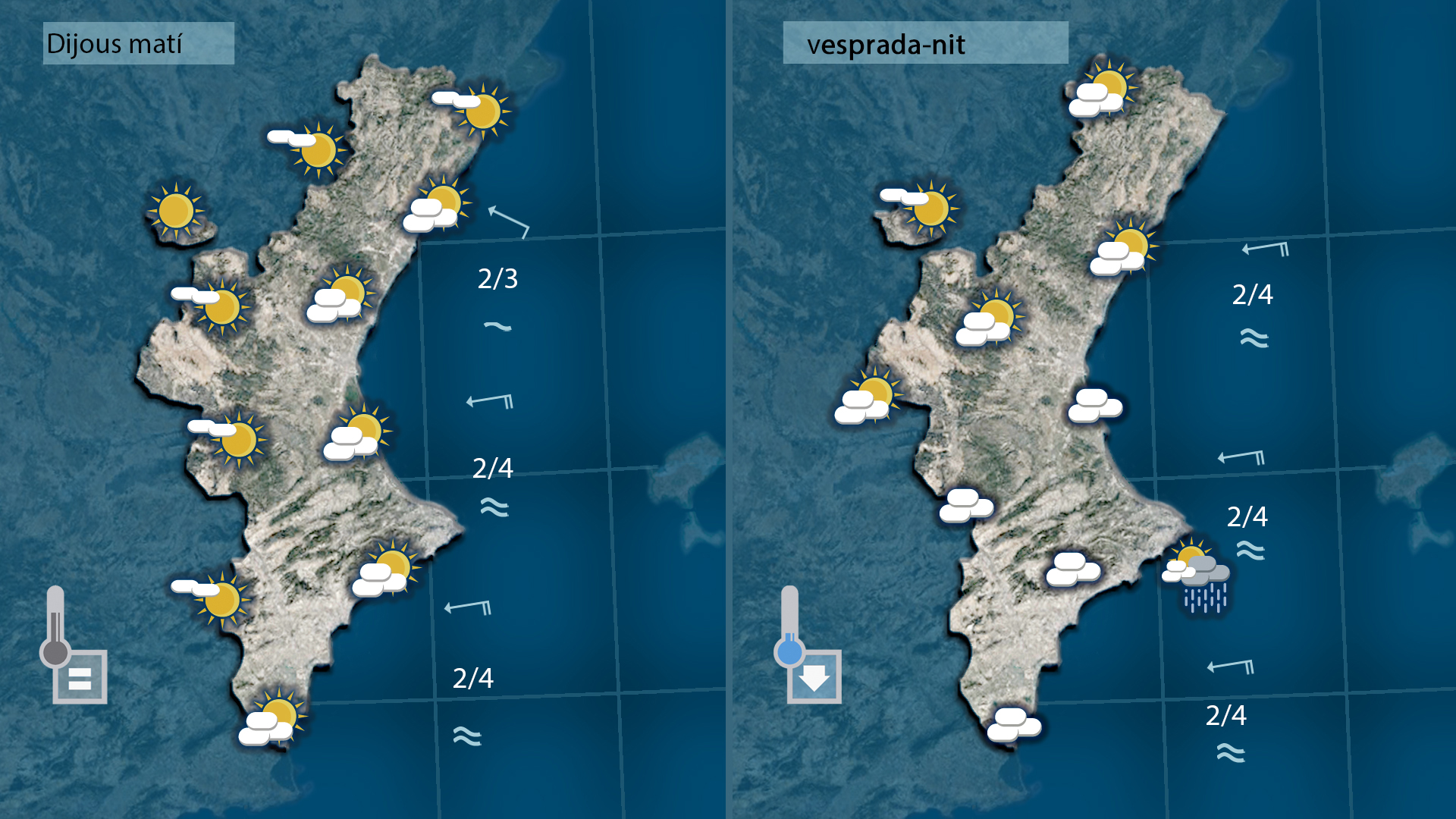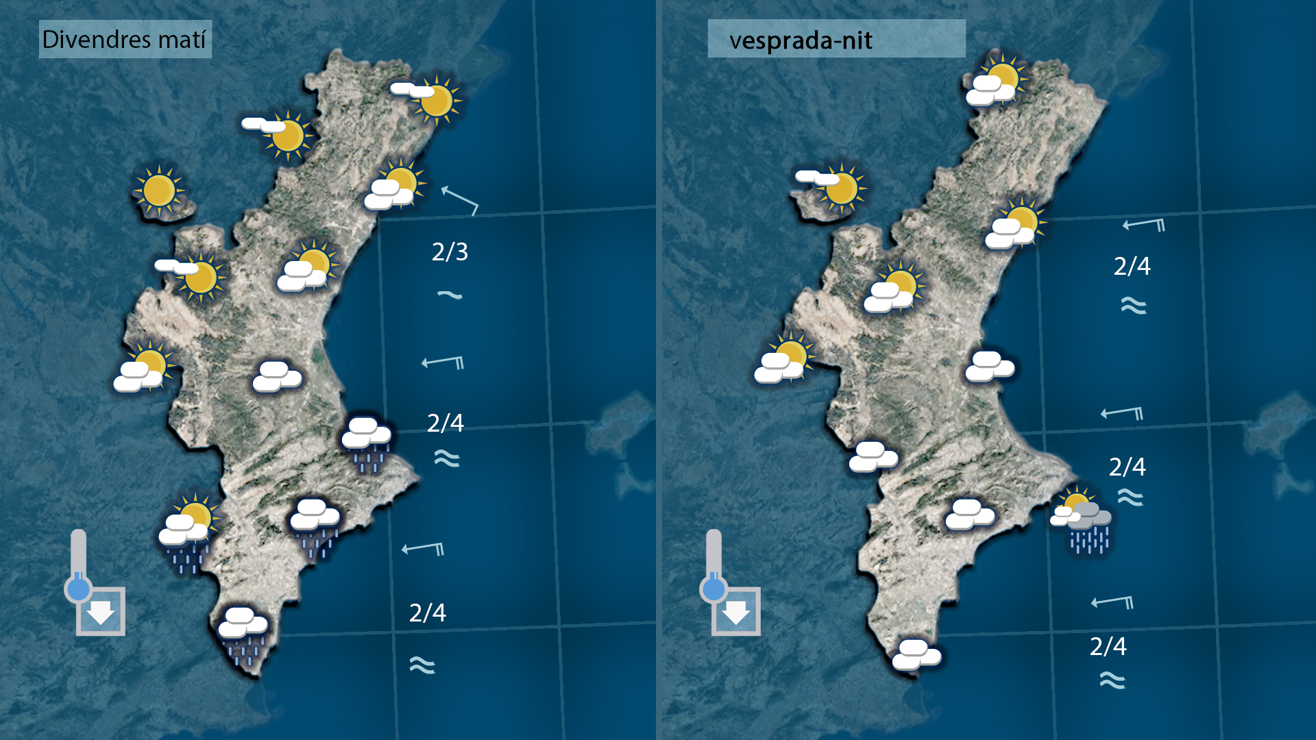 Al nord el cel estarà més ennuvolat, però amb menor probabilitat de precipitacions. Les temperatures baixaran de forma clara, deixant un ambient més fresc que els dies anteriors.