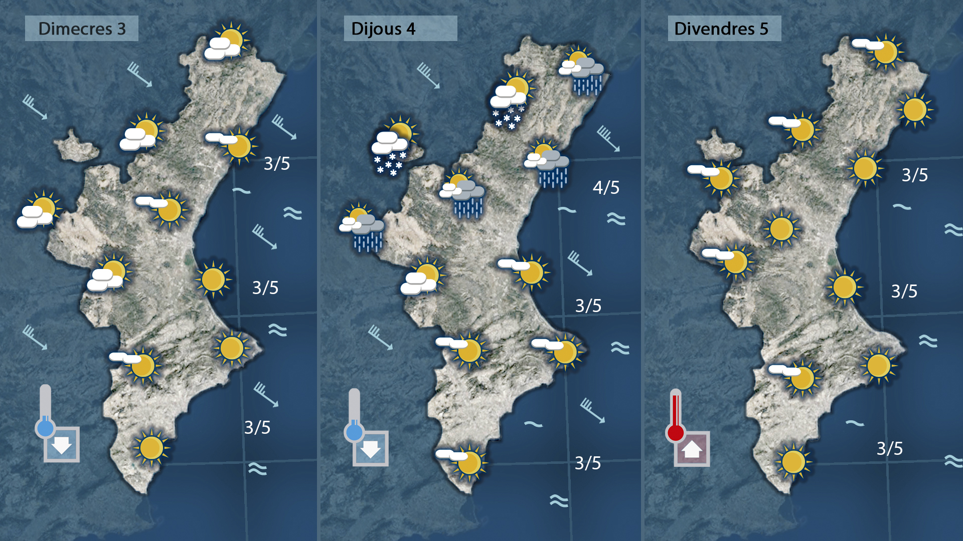 A primera hora hui caldrà estar atents a pluges que poden aparéixer al litoral i prelitoral sud, impulsades per vents de gregal i amb una mar alterada. A la vesprada el sol s’imposarà i el vent encalmarà, deixant temperatures tan fresques com les de hui. Demà dimarts el ponent tornarà a dominar i evitarà que les temperatures baixen més. Dimecres i dijous farà vent i més fred, però amb molt poca probabilitat de precipitació. Divendres el sol anunciarà un cap de setmana estable i amb ambient suau.
