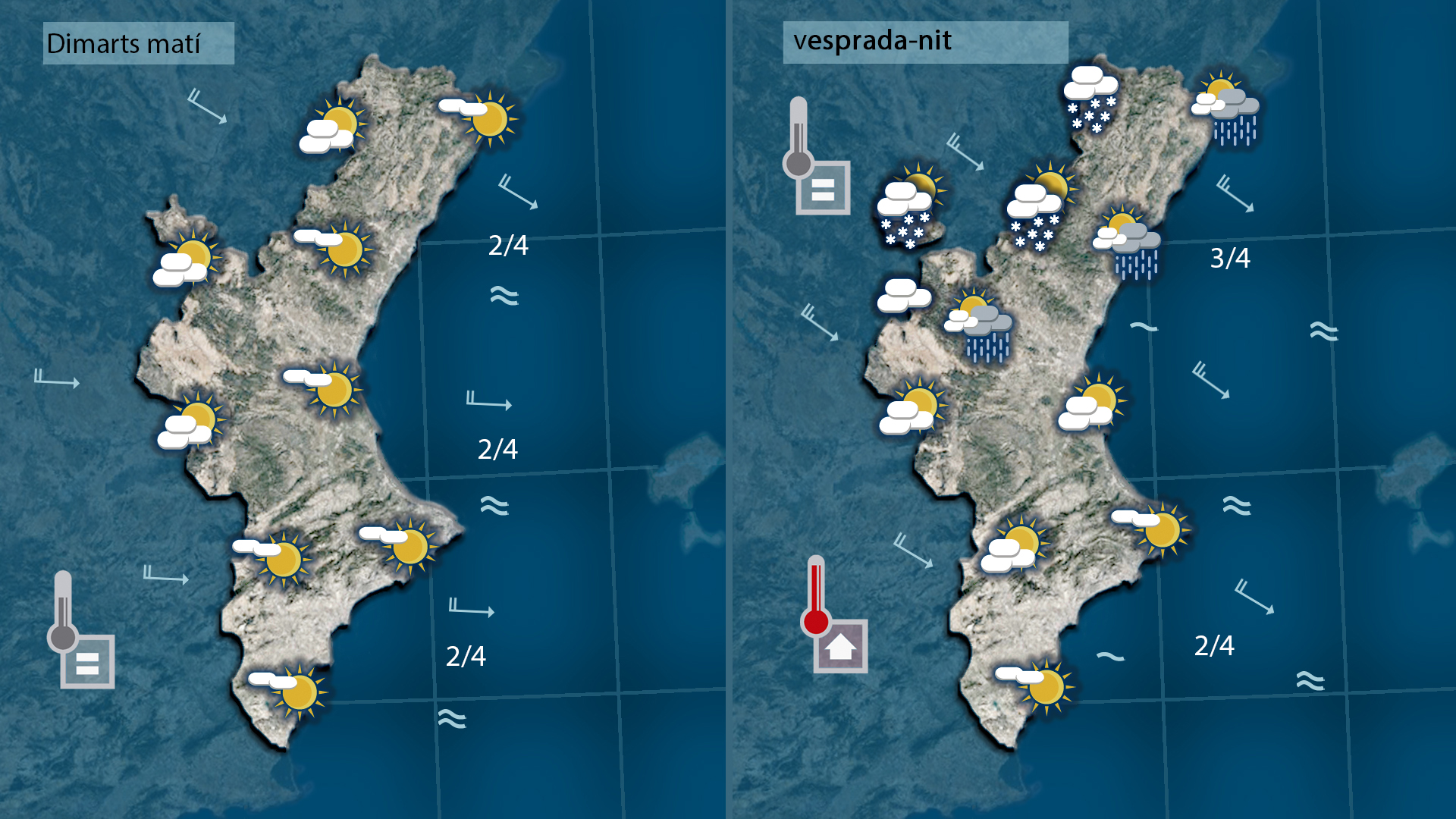 La jornada començarà amb cel variable i ambient fresc. Demà dimarts, el ponent i un nou front atlàntic deixaran ruixats a les zones d’interior, especialment a Castelló, on la cota de neu baixarà fins als 1.000-1.100 metres. Dimecres i dijous tindrem dies de vent i de fred, amb més núvols dijous i probabilitat de pluges febles i algun floquet de neu a les muntanyes més altes. Divendres encalmarà el vent i el sol tornarà amb força.