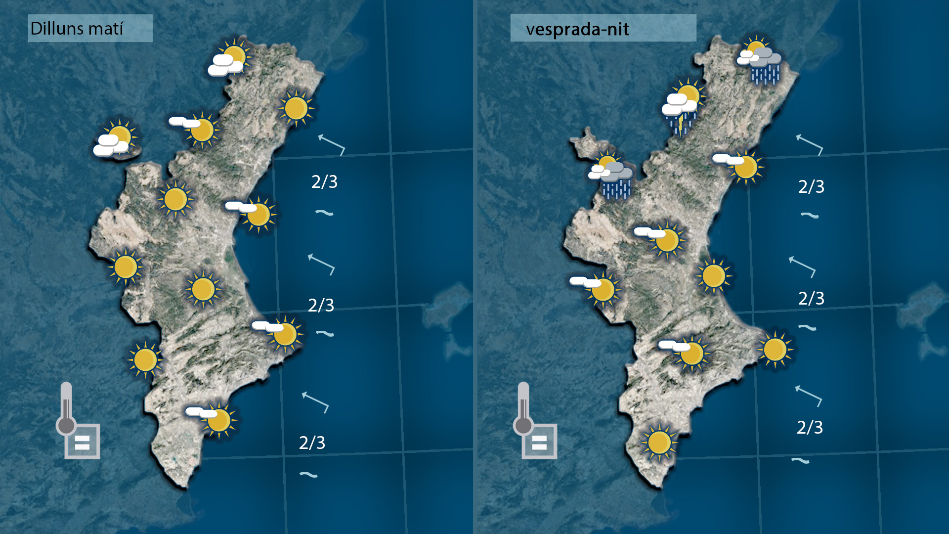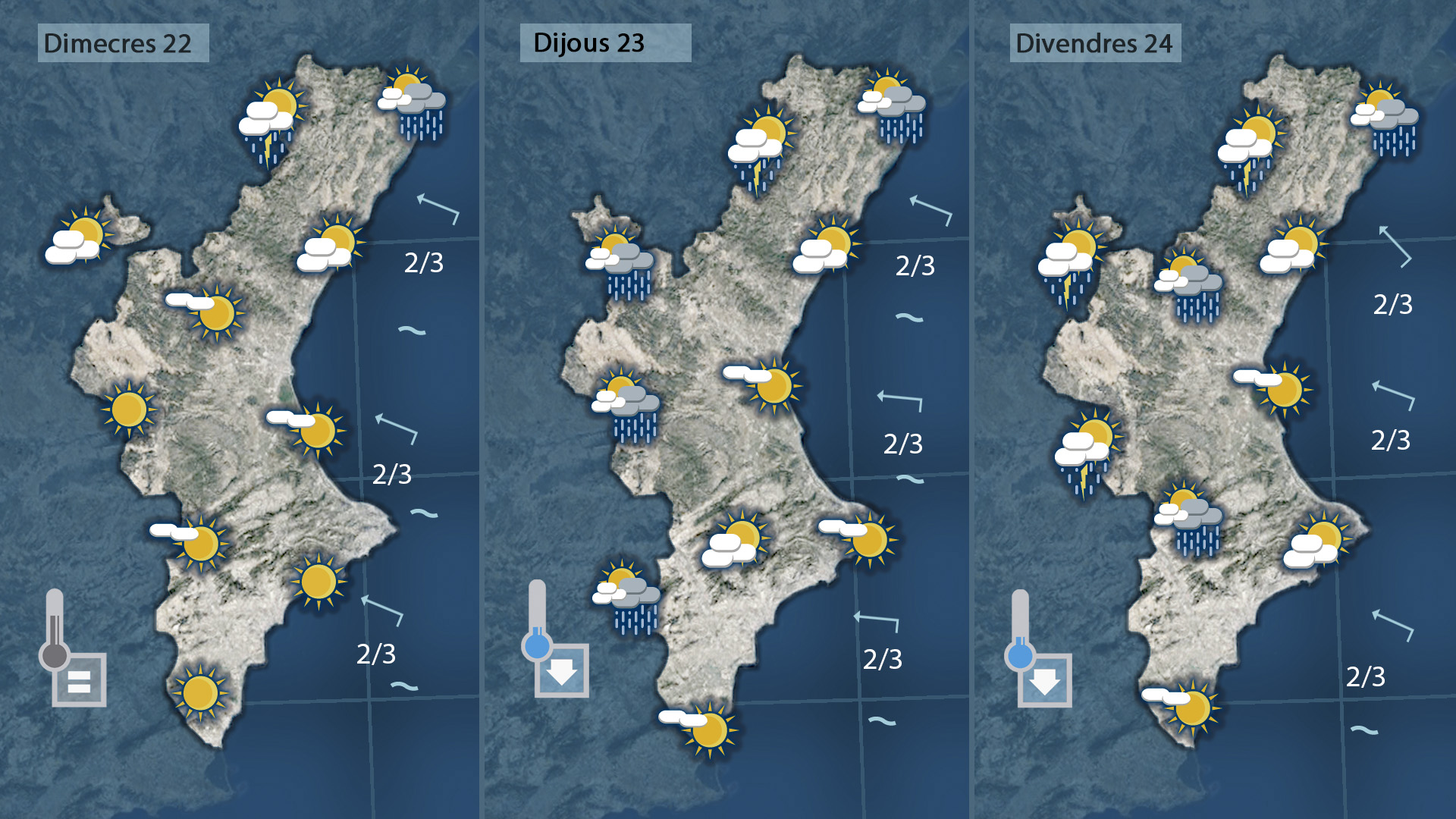 Les temperatures nocturnes es mantindran molt suaus, amb valors entre els 10 i 15 °C a la major part del territori, mentre que les màximes seran igual o fins i tot superiors a les del cap de setmana. Només a l’extrem nord, al voltant de la ratlla de l’Aragó, podria escapar-se algun tro de manera molt puntual.