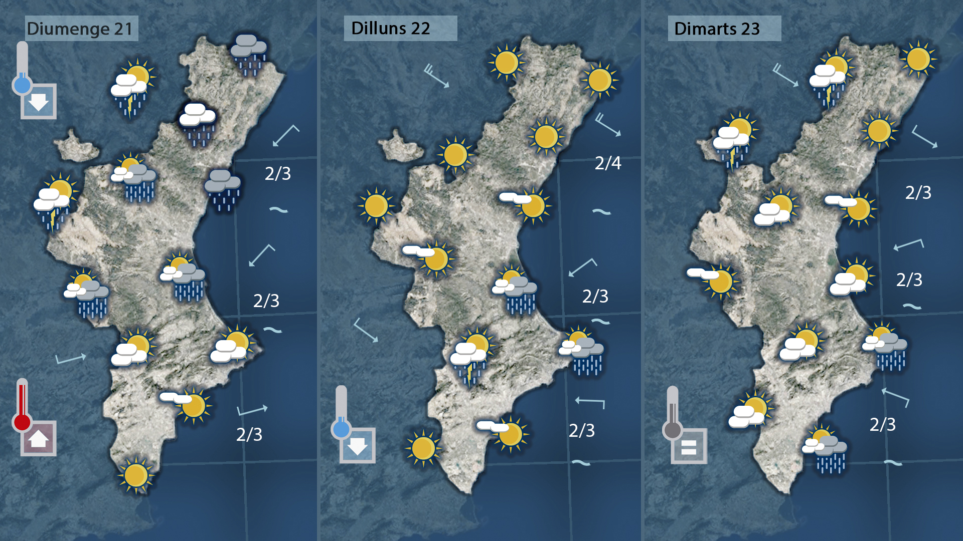 El sud del País Valencià viurà un escenari diferent. Ací el ponent mantindrà les temperatures altes durant el cap de setmana, i això farà més difícil l’arribada de la pluja. Dissabte i diumenge continuaran amb calor, amb màximes que encara podran superar els 30 graus en alguns punts. El canvi arribarà més tard: dilluns, amb el gir dels vents i l’entrada d’una massa d’aire més fresca, les temperatures baixaran, però amb menys probabilitat de ruixats.