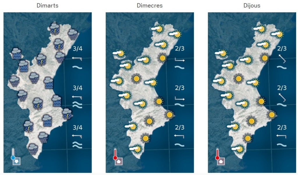 Demà dimecres l’oratge es presentarà més clar i estable, amb sol i un vent fluix de ponent que netejarà l’atmosfera. Les temperatures, després del descens d’estes hores, remuntaran fins a fregar de nou els 30 graus al centre del dia. A partir de dijous, la calma serà la tònica dominant: jornades assolellades, temperatures cada volta més altes i un recordatori clar que, malgrat els ruixats, encara estem en estiu.