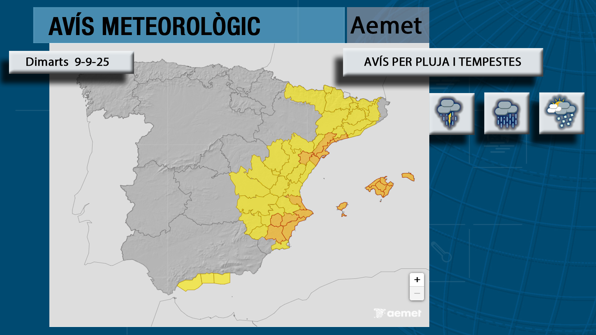 Aquest dimarts, 9 de setembre, arriba amb l’oratge de nou com a protagonista. Després de l’episodi de pluja d’ahir, hui la inestabilitat es manté i l”Aemet ha activat avisos taronja per precipitacions intenses a la Ribera, la Safor, la Vall d’Albaida, la Marina, el Comtat i l’Alcoià, així com al nord i el sud del País Valencià. Es preveu que les tempestes siguen irregulars en la distribució, però localment intenses, amb acumulats significatius en poc de temps. La situació començarà a millorar a partir de la nit, quan el vent gire a ponent i la mar vaja encalmant.