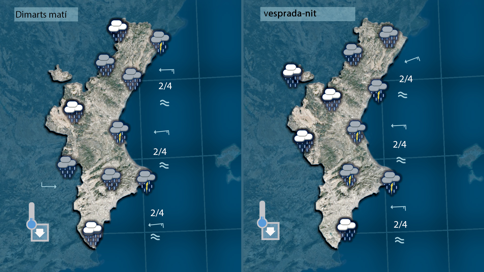 Al nord, la jornada es presenta amb intervals de núvols i ruixats que podran ser localment forts, sobretot al Maestrat i a la Plana. Les pluges seran més irregulars a l’interior, però no es descarta que arriben a totes les comarques. L’avís taronja inclou l’extrem septentrional del territori, on els aiguats poden descarregar amb intensitat. Les temperatures es mantindran fresques durant la pluja i només repuntaran lleugerament al centre del dia.