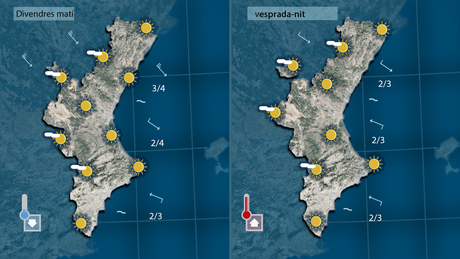 El vent desapareixerà amb rapidesa i donarà pas a dies assolellats i tranquils. Les temperatures començaran a recuperar-se de manera progressiva. Amb l’entrada de xaloc durant el cap de setmana, a la costa els termòmetres tindran més dificultats per superar els 20 graus, però a les comarques interiors l’ascens serà més evident.