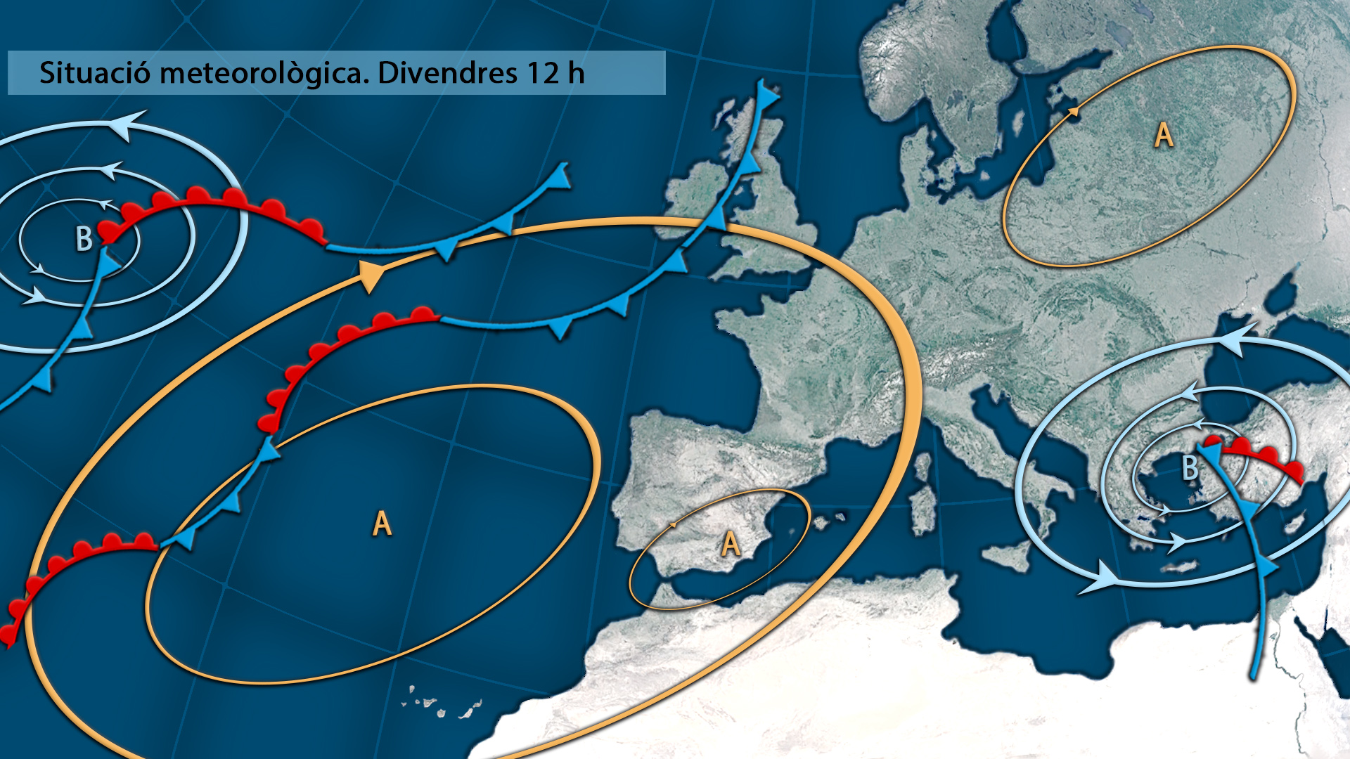 El flux de l’oest impulsat per les borrasques atlàntiques quedarà bloquejat per l’avanç d’un centre d’altes pressions des del sud-oest de la Península. L’anticicló ens abraçarà completament el cap de setmana i bona part de la setmana vinent, canviant radicalment el panorama atmosfèric.