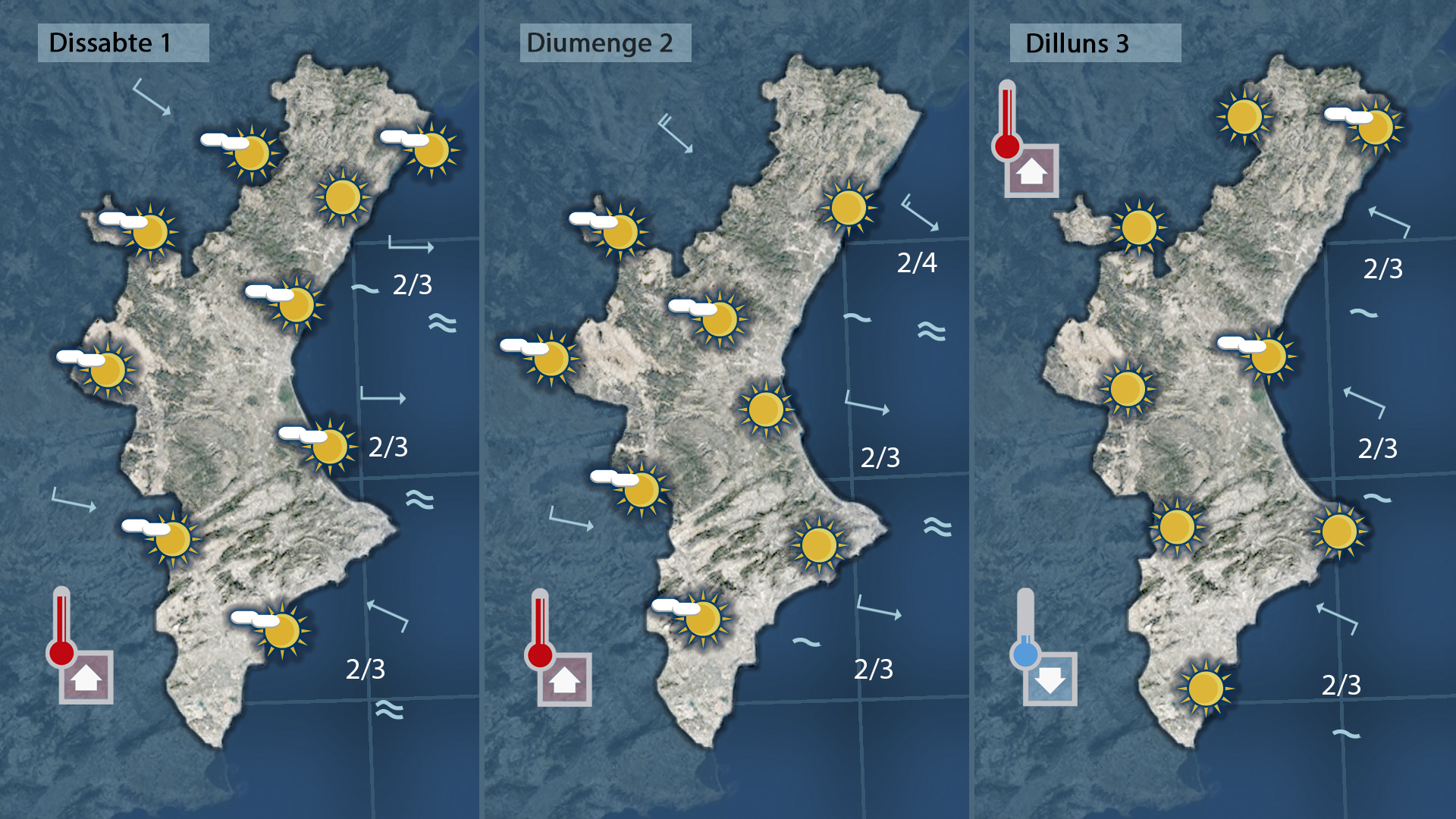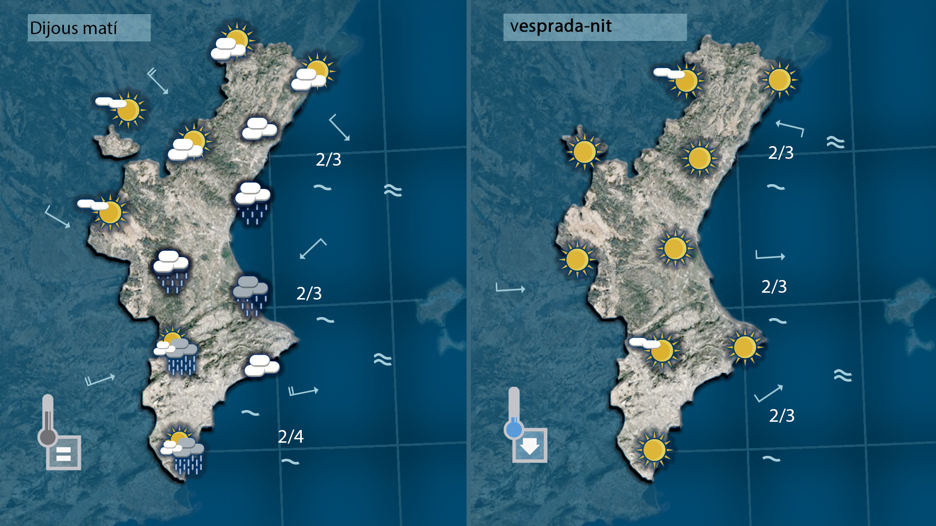 Les pluges s’aniran esvaint ràpidament i el sol tornarà a dominar des de primera hora del matí. El vent de mestral bufarà fluix i deixarà una sensació tèrmica més agradable al centre del dia. Les temperatures es mantindran entre els 10 °C de mínima i els 22 °C de màxima.