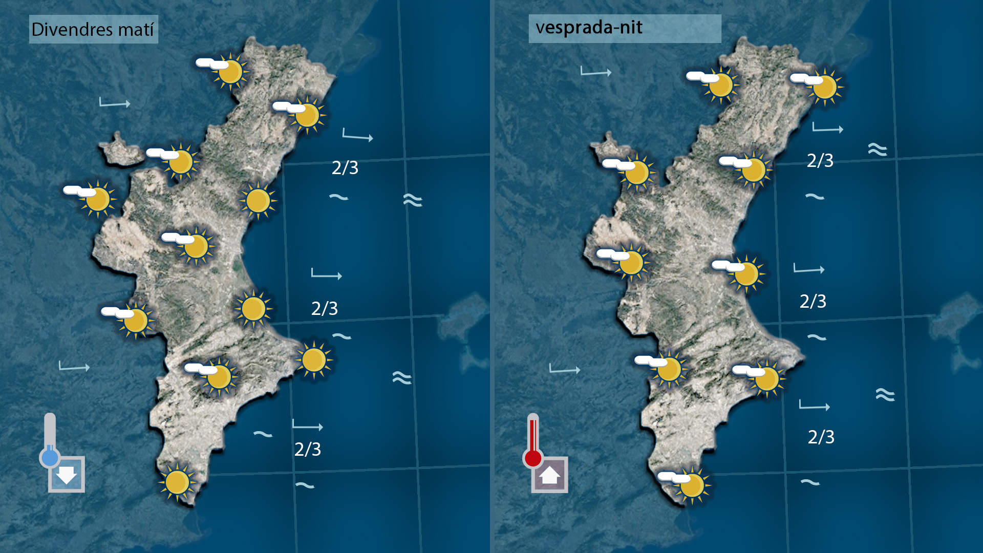 Matí amb intervals de núvols i algun ruixat esporàdic, especialment a les comarques centrals. Cap a migdia el cel quedarà ras i l’ambient serà suau, amb màximes al voltant dels 24 °C. El vent bufarà variable fins a estabilitzar-se de ponent.