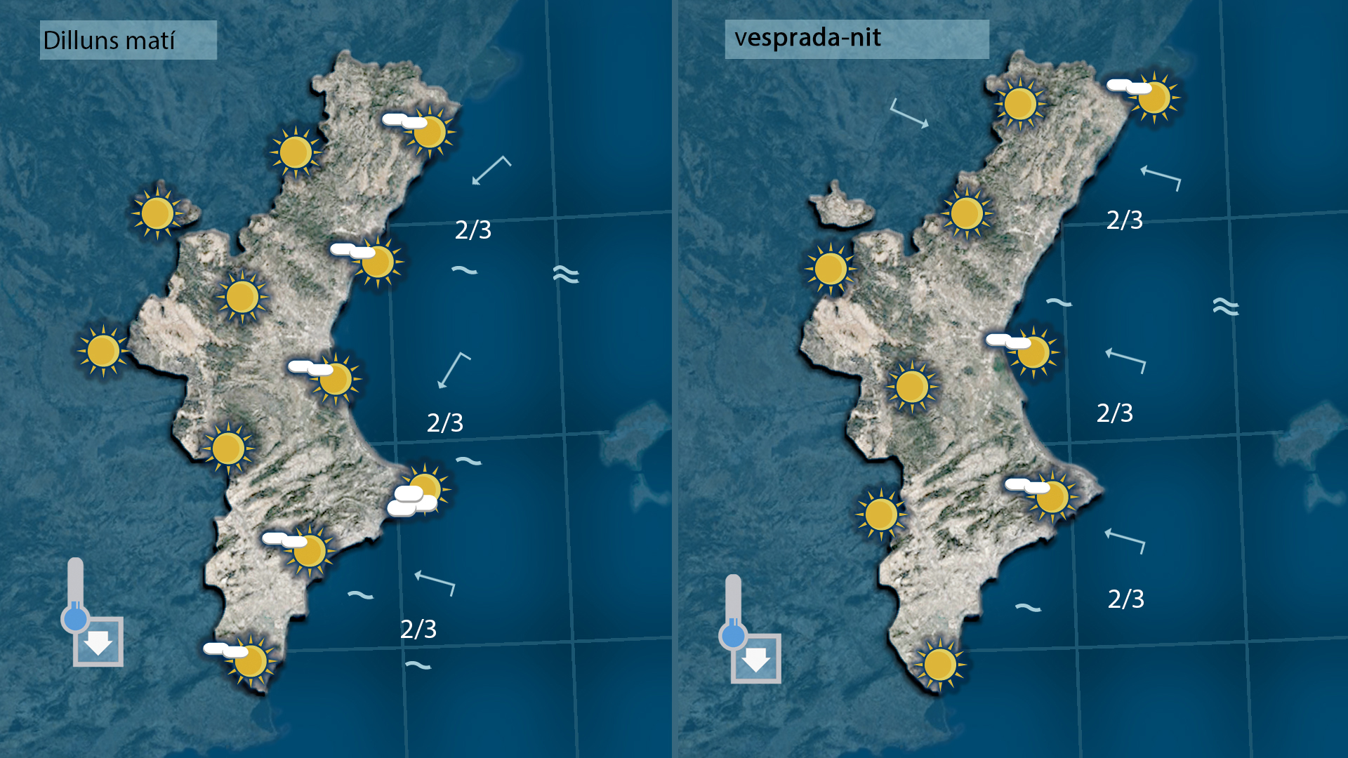 Predomini del sol i oratge suau, amb brises de llevant que aportaran una mica més d’humitat. Les temperatures baixaran lleugerament dilluns, però tornaran a repuntar a partir de dimarts. A mitjan setmana es podrien veure més núvols, però amb molt baixa probabilitat de precipitacions.