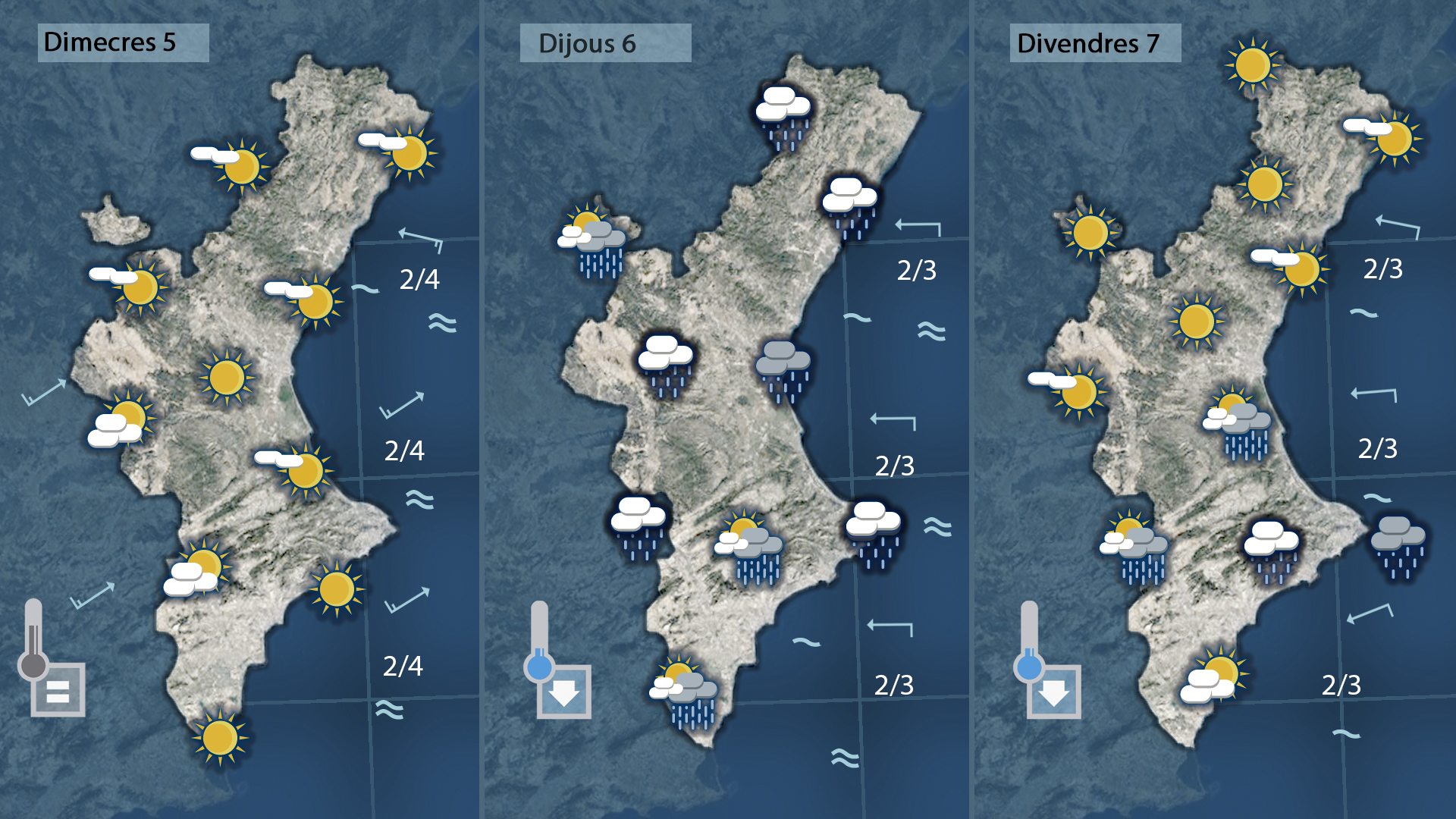 Setmana tranquil·la amb cels parcialment ennuvolats i temperatures agradables, pròximes als 25 °C en punts del litoral. El vent de llevant moderat deixarà una sensació tèrmica més suau, però sense canvis importants. Divendres podria aparèixer algun ruixat feble i dispers al litoral sud, sense més conseqüències.