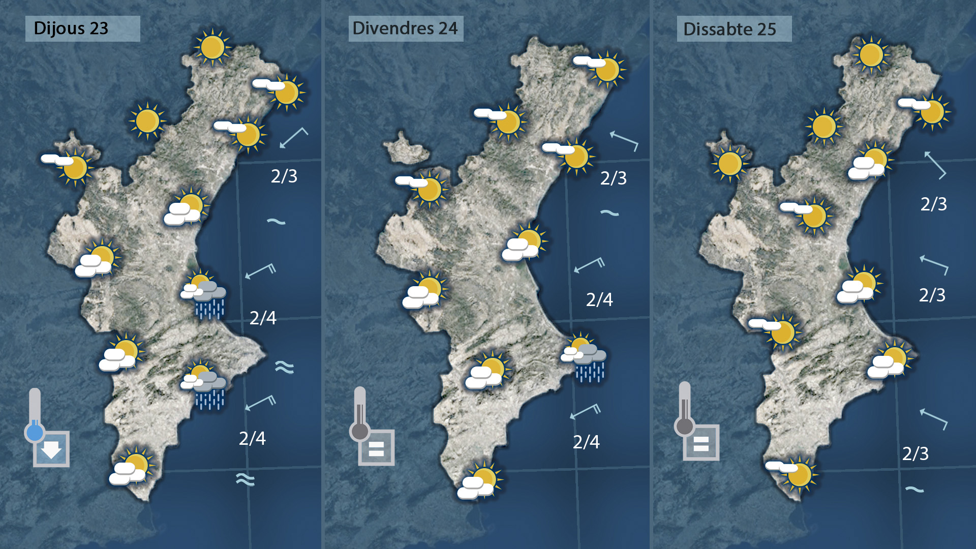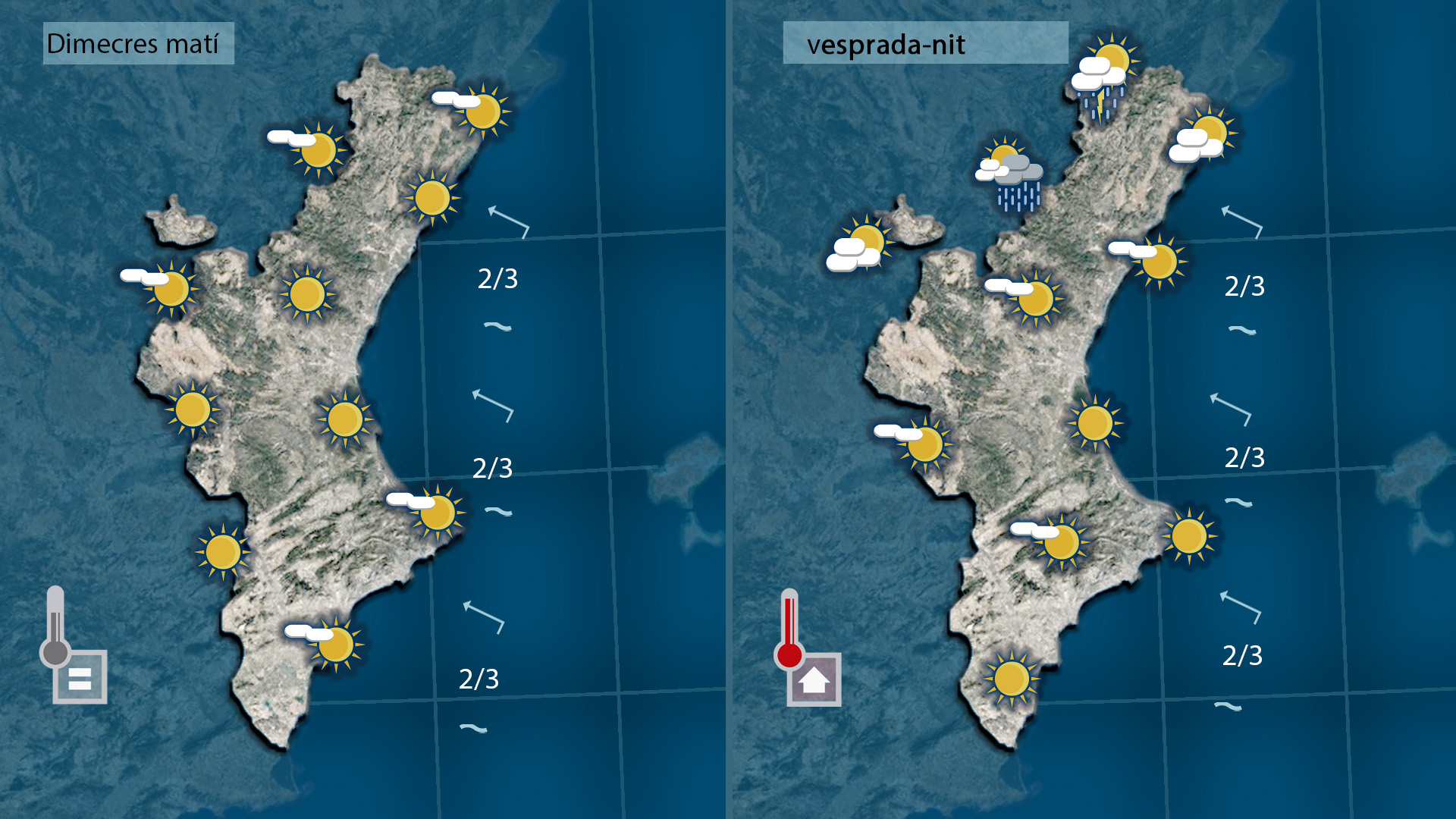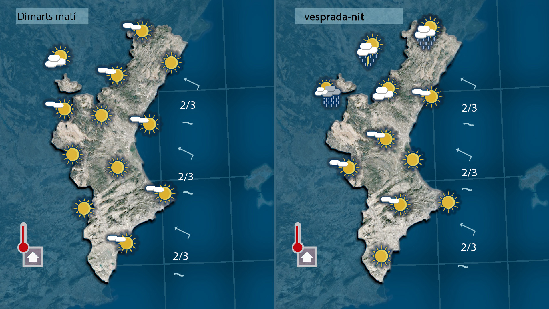 Al sud l’estabilitat serà pràcticament total, amb cel poc ennuvolat i temperatures altes. Les tronades no arribaran o ho faran de manera molt puntual i sense importància.