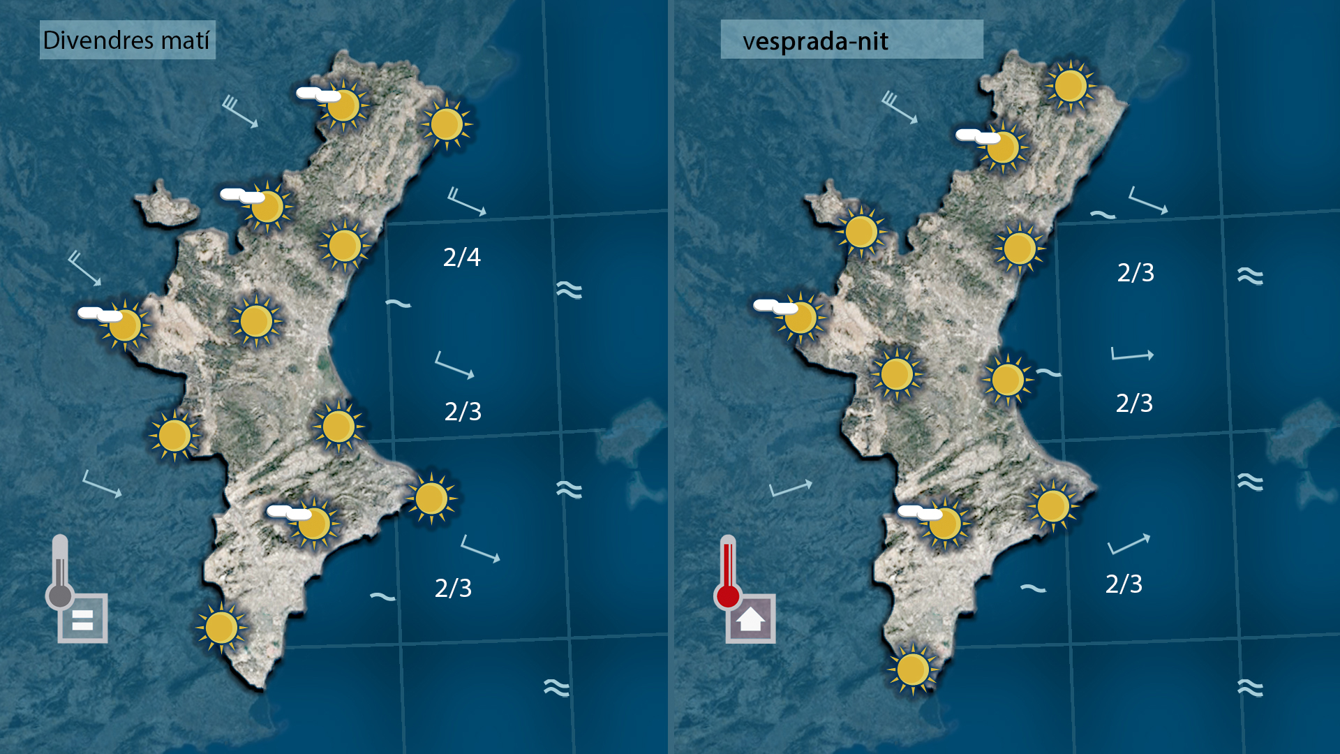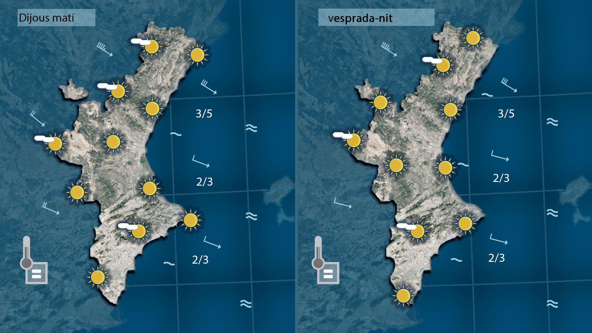 La jornada de hui estarà dominada pel sol, amb només alguns núvols alts decoratius. Les temperatures es mantindran semblants a les d’ahir: fresques a primera hora, suaus al centre del dia i amb una nova baixada de cara a la nit.