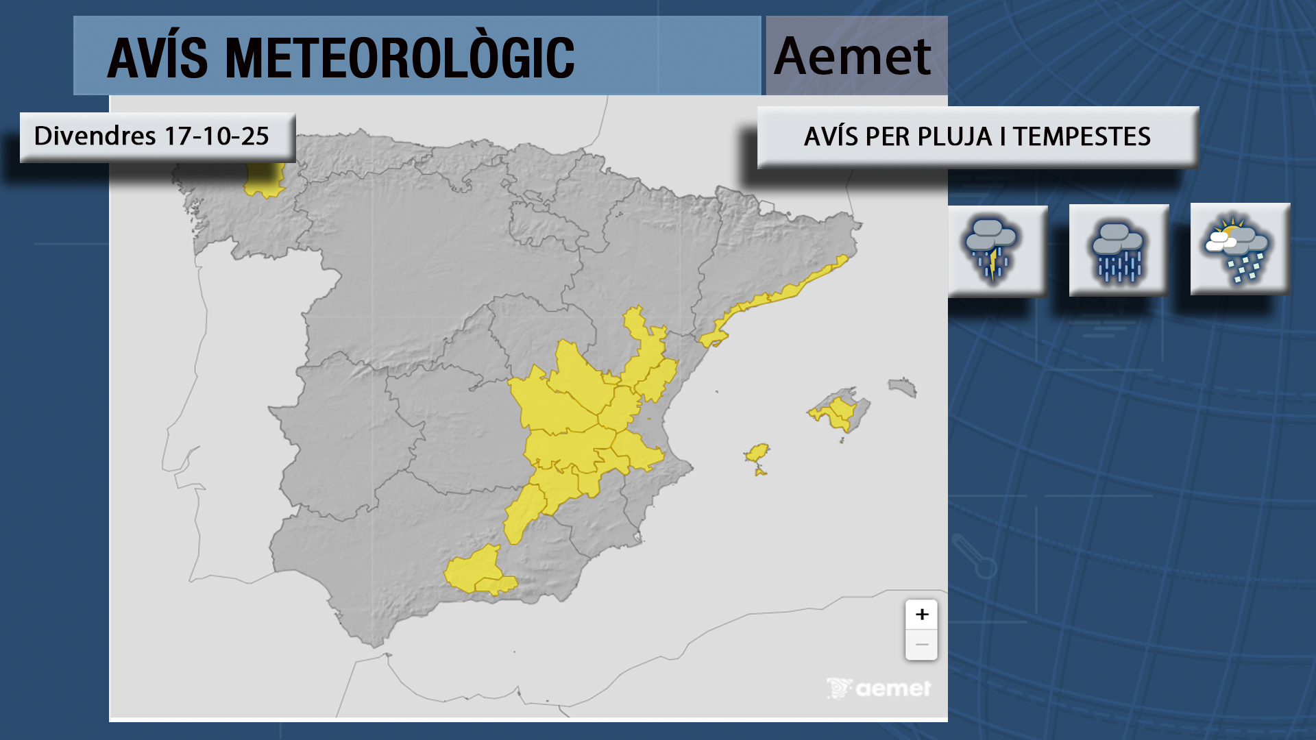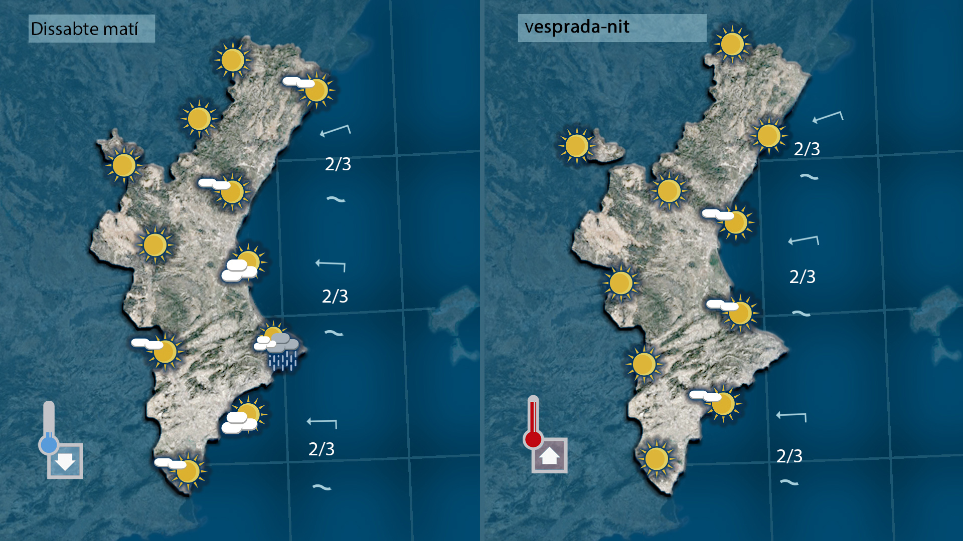 Els ruixats residuals del matí deixaran pas a estones de sol, que afavoriran la formació de tronades vespertines a les serres del Camp de Túria i la Vall d’Albaida. Tot i això, l’ambient general serà més tranquil a mesura que avance el dia. Dissabte el sol dominarà i les temperatures, encara fresques a primera hora, pujaran durant el migdia amb valors suaus i agradables.