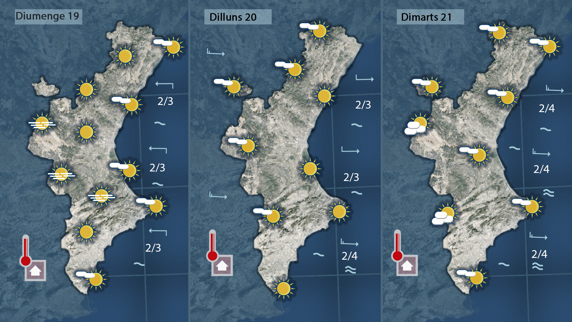 Al sud, la jornada començarà amb algun plugim o gota despistada, especialment a la costa del Baix Segura i el Vinalopó, però ràpidament el sol s’imposarà. El cap de setmana es presenta estable, amb cels clars i un ambient més càlid. Les màximes s’acostaran als 30 °C diumenge, especialment a les zones litorals de l’Alacantí.