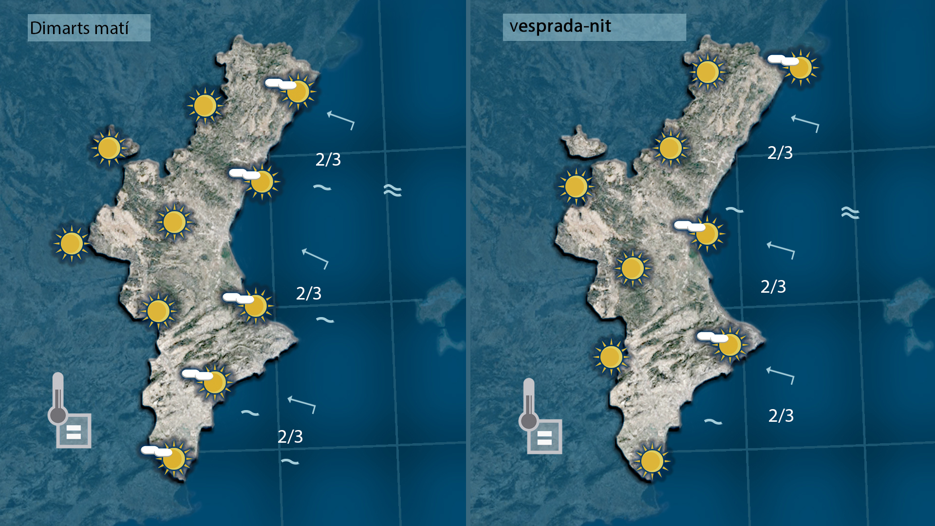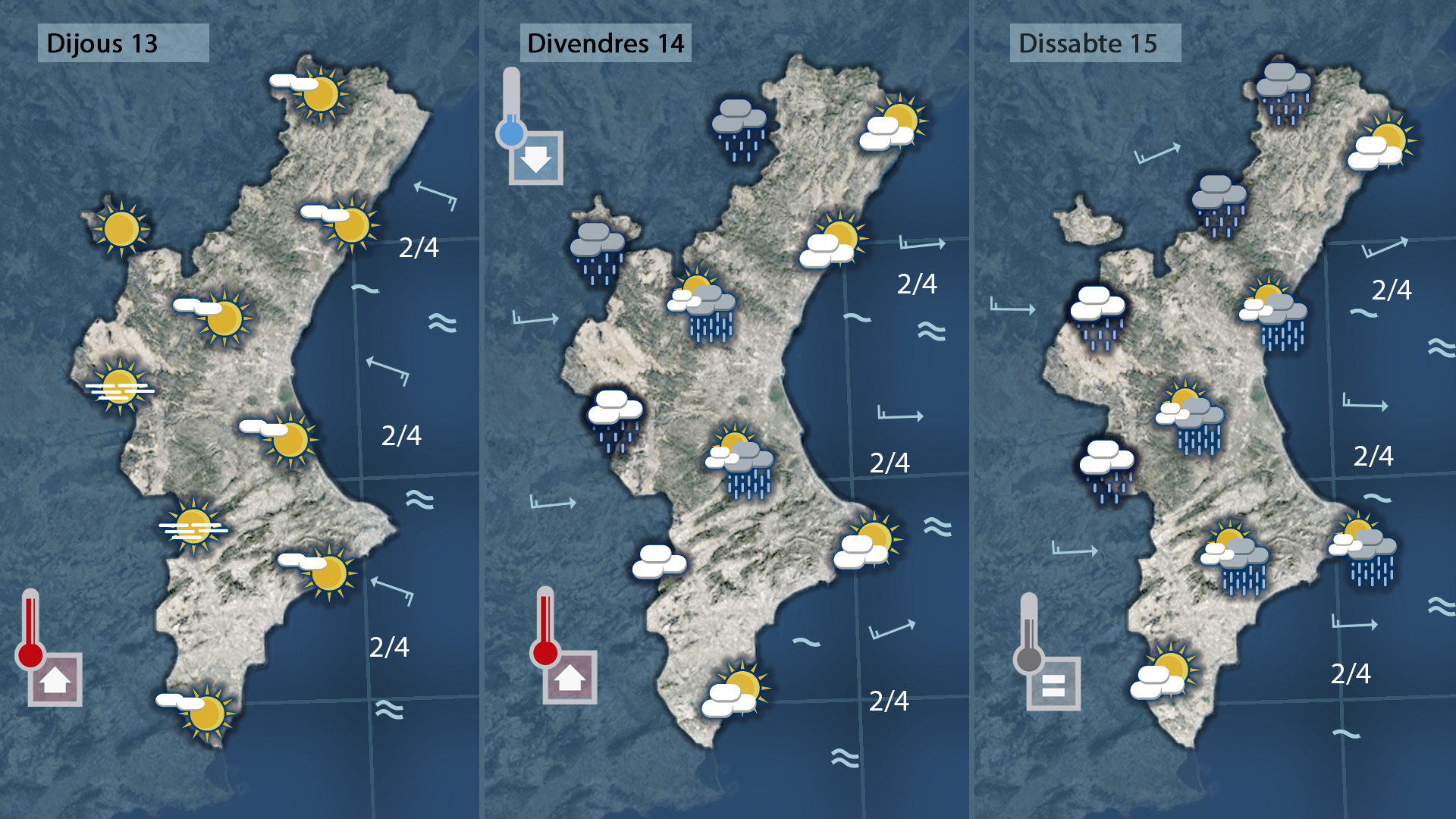Els pròxims dies estaran marcats per la calma absoluta i les temperatures agradables. Les nits seran més càlides i els migdies tornaran a superar els 25 °C en punts de la Ribera i l’Horta. L’ambient serà humit i tranquil, amb presència de boirines matinals i cels blanquinosos per la presència de núvols alts. Dijous continuarà la bonança, i divendres, amb el retorn del ponent i el llebeig, podrien aparèixer pluges febles que avançarien d’oest a est.