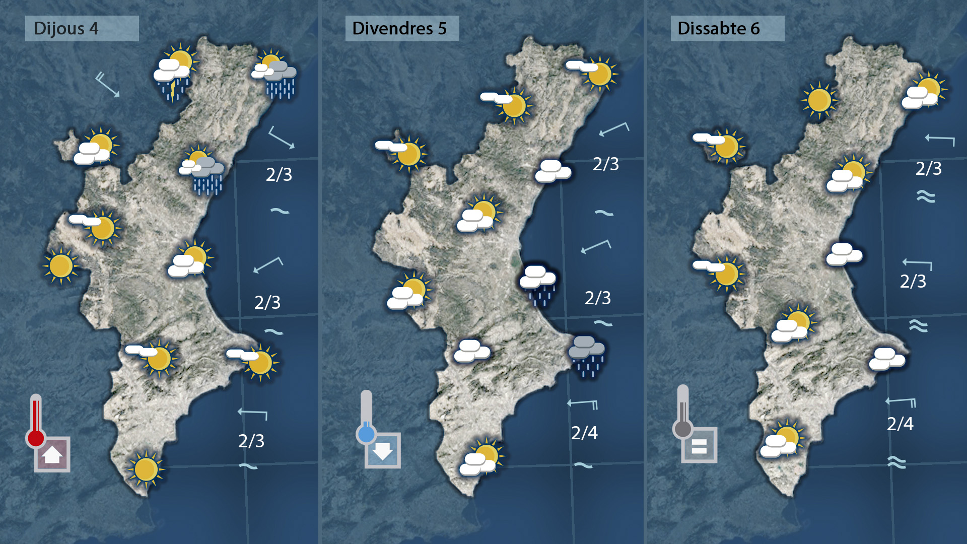 Dijous encara serà un dia fort de calor, però amb símptomes d’inestabilitat al nord. Divendres, el cel es presentarà més carregat i es podran produir plugims a la costa, amb un ambient bascós però temperatures més baixes. Dissabte, la nuvolositat es trencarà i els termòmetres tornaran a pujar. Tot apunta que haurem d’esperar un poc més perquè la tardor es faça notar.