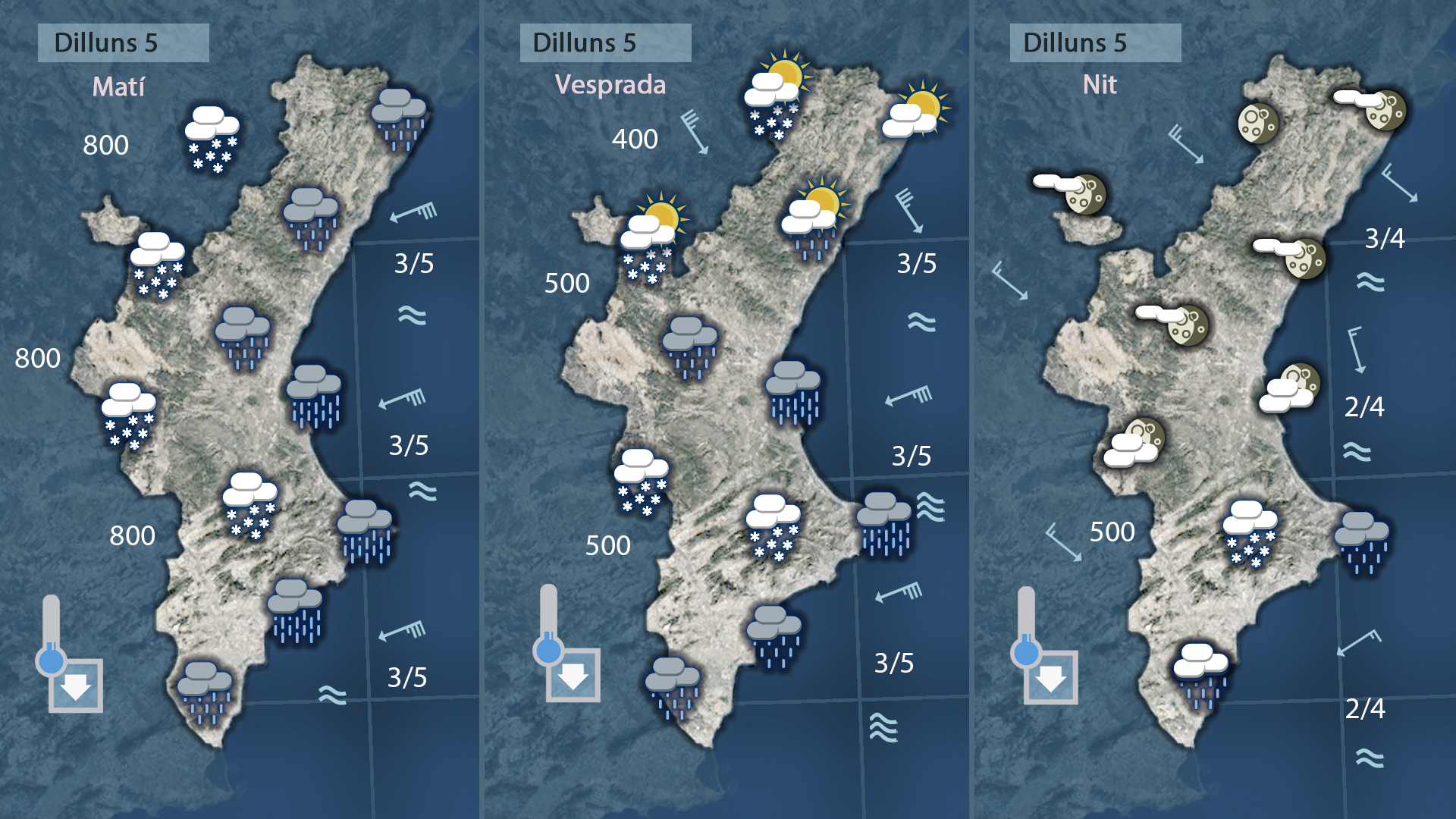 El sud continuarà sent la zona més castigada per la pluja, sobretot fins a migdia. A partir de la vesprada i nit, les precipitacions quedaran pràcticament restringides al sud del territori. La neu quedarà reservada a les serres per damunt dels 800-900 metres. Dimarts encara podria quedar algun ruixat residual de matí, però el fred i el vent seran els protagonistes. Dimecres, situació semblant.