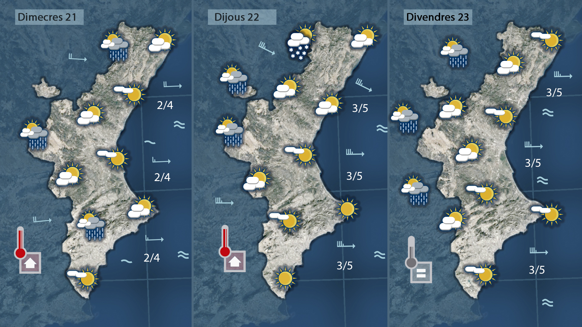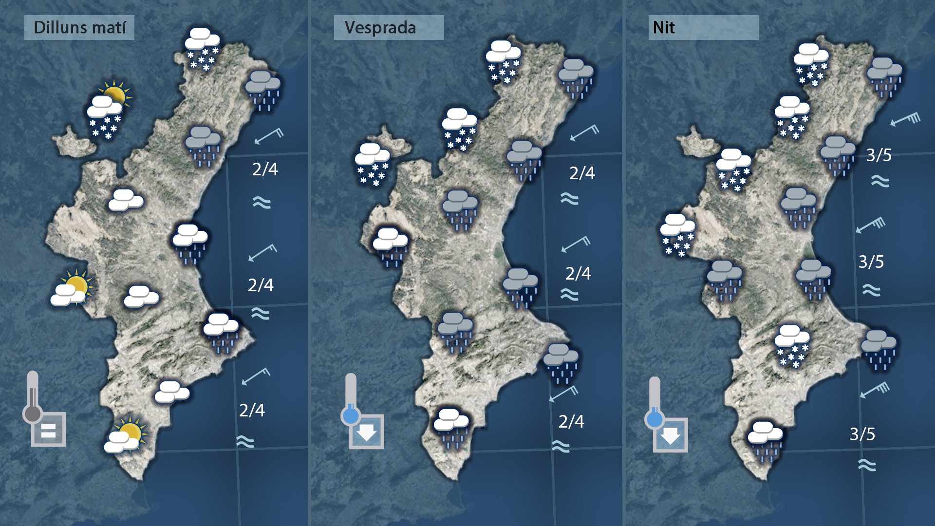 La pluja també anirà guanyant protagonisme amb el pas de les hores, especialment entre la nit i la matinada. Dimarts serà el dia més delicat, amb precipitacions que podran ser localment intenses, sobretot a la Marina, i amb una mar molt alterada pel vent marítim. A l’interior, la neu podria aparéixer a les cotes més altes, tot i que serà més testimonial que al nord.