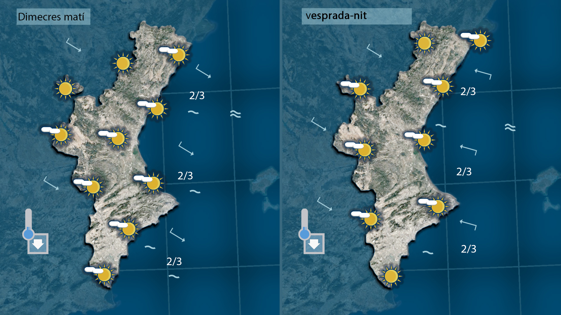 Les temperatures han baixat de manera clara i la nit ha sigut freda a l’interior, amb mínimes pròximes als 4 o 5 °C. Durant el dia, el sol dominarà, però l’ambient continuarà gèlid. Dijous arribarà el punt àlgid del fred amb vent moderat de mestral i sensació tèrmica més baixa. A la vesprada no es descarta algun ruixat feble o pas de núvols compactes, sense conseqüències importants. Divendres serà el dia més fred de la setmana, amb màximes que quedaran per davall dels 12 °C a la Vall d’Albaida i la Costera. Dissabte, amb el canvi de vent, el fred s’atenuarà lleugerament.