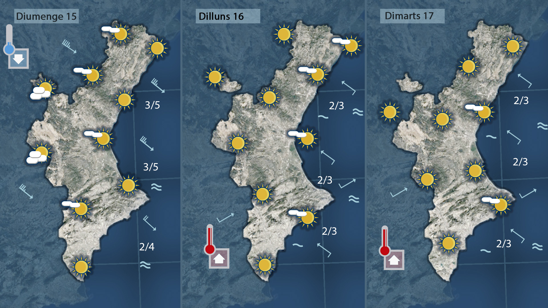 Diumenge l’ambient serà encara fresc, especialment al matí, però el vent començarà a encalmar a partir de mig matí o migdia. El sol dominarà el cel i convidarà a eixir al carrer per viure el final de la Magdalena a Castelló de la Plana i l’inici dels dies grans de les Falles a València i a moltes altres poblacions.