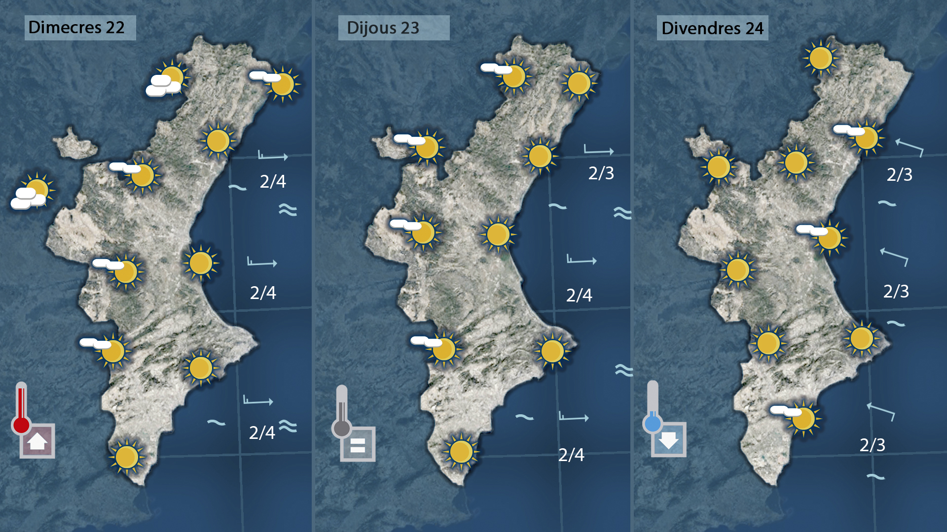 El vent de ponent farà pujar notablement les temperatures al sud del País Valencià. A les comarques del Baix Segura i l’Alacantí es podrien assolir els 30 °C entre dimecres i dijous, amb una sensació tèrmica més alta per la baixa humitat. Els cels es mantindran clars, amb núvols alts sense conseqüències i un ambient de mànega curta durant tot el dia.