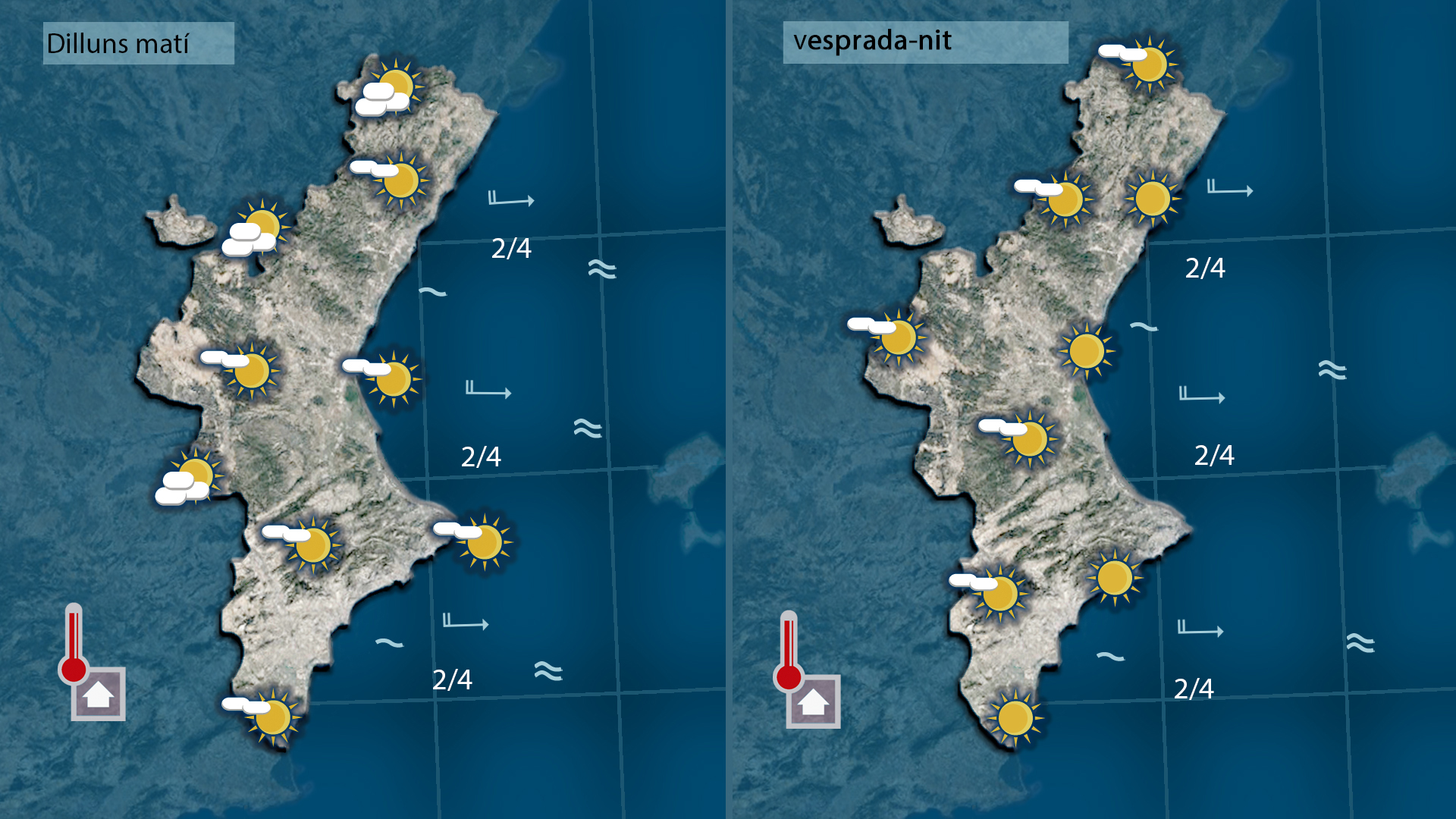 El cel es mantindrà estable amb intervals de núvols prims, més abundants a les zones de l’interior. Les nits seran més suaus i els dies, agradablement càlids. Dimarts les temperatures pujaran de manera moderada, i entre dimecres i dijous es podrien superar els 25 °C a la Plana i l’Alt Palància. El vent de ponent es deixarà sentir amb ratxes moderades, especialment a les zones més altes dels Ports i el Maestrat.