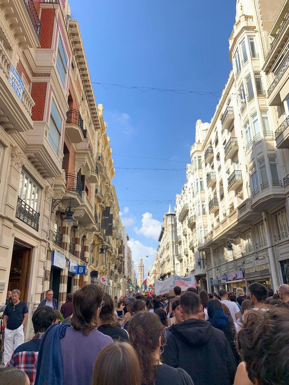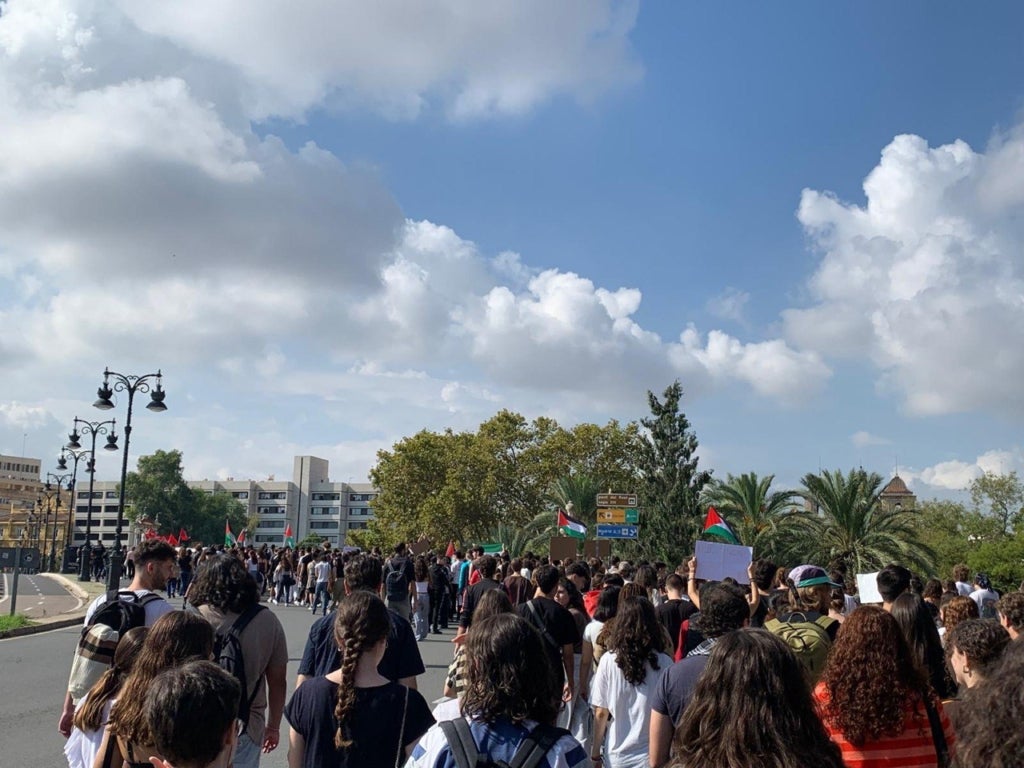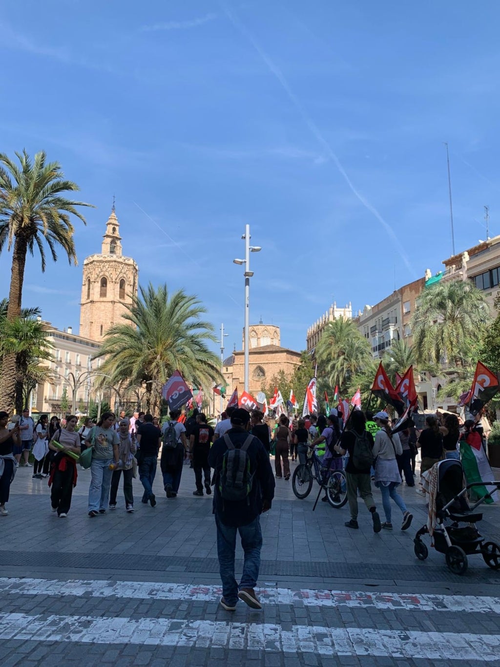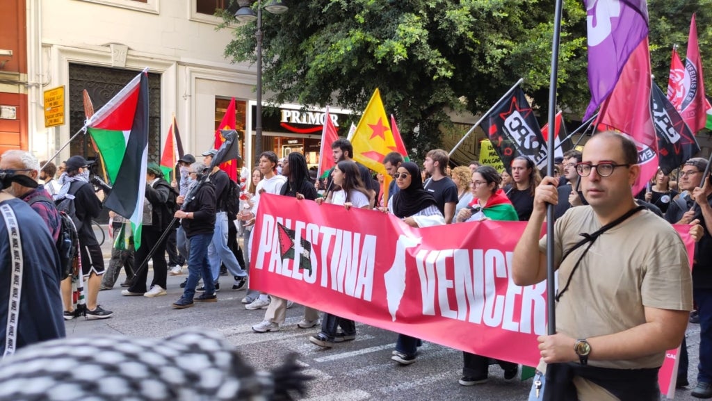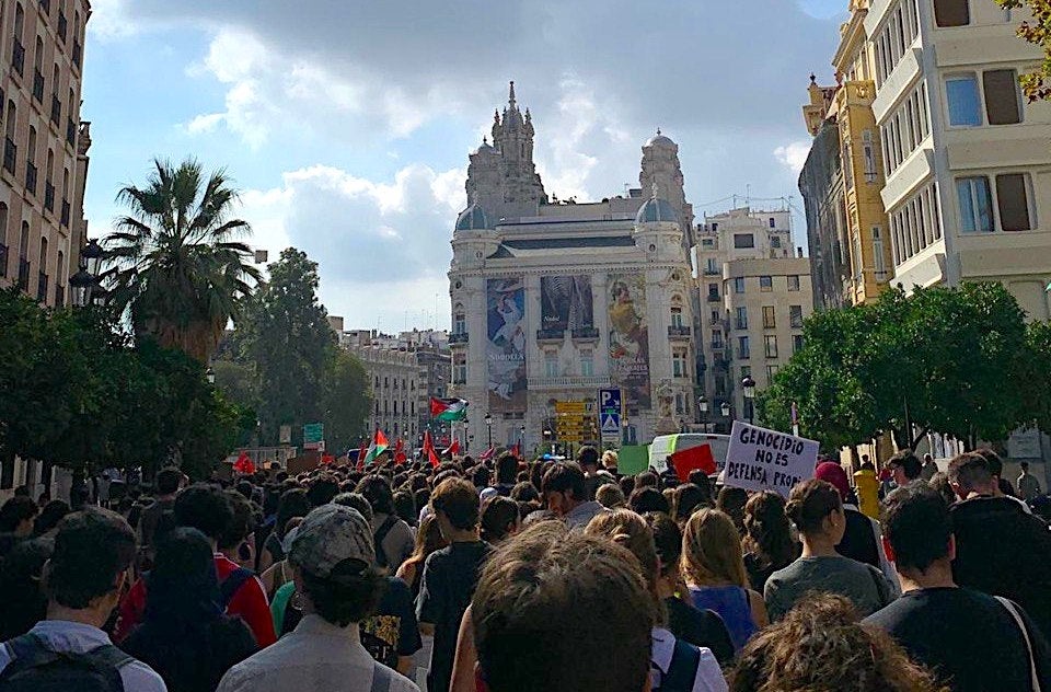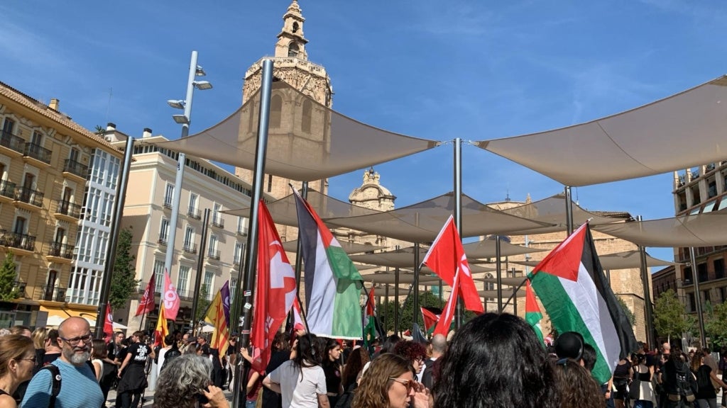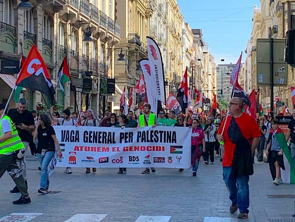 Milers de persones s’han sumat aquest matí al piquet unitari de la vaga general solidària amb Palestina convocada per CGT, CNT, COS i Intersindical Valenciana. El piquet, que ha funcionat a la pràctica com una manifestació, ha eixit a les 12 del matí de l’Estació del Nord i ha recorregut bona part del centre de la ciutat fins a la plaça de la Mare de Déu, amb crits demanant el boicot i la fi de relacions comercials amb Israel.