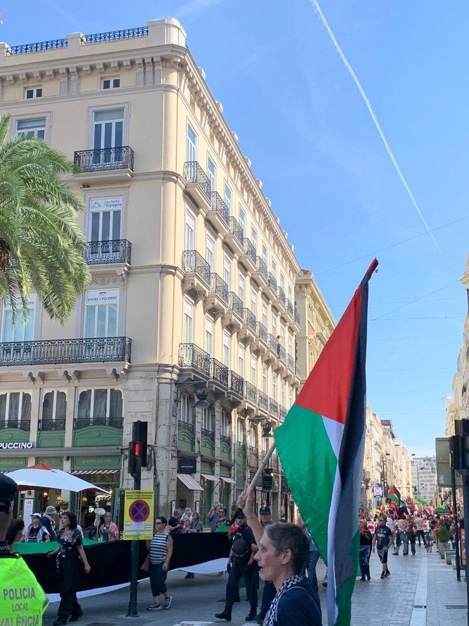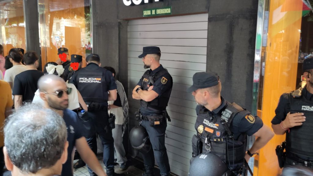El moment més tens ha estat quan la marxa ha passat davant d’una cafeteria Starbucks, al carrer Colon. La capçalera de la manifestació s’aturava a fer una representació on se simulaven les víctimes mortals d’un bombardeig. En aquell moment, diversos antiavalots han retingut i assetjat un xiquet que volia enganxar una enganxina a la persiana, el que ha provocat que els manifestants s’aturaren amb crits i xiulets, demanant el boicot a una empresa acusada de finançar i beneficiar-se de l’ocupació dels territoris palestins.