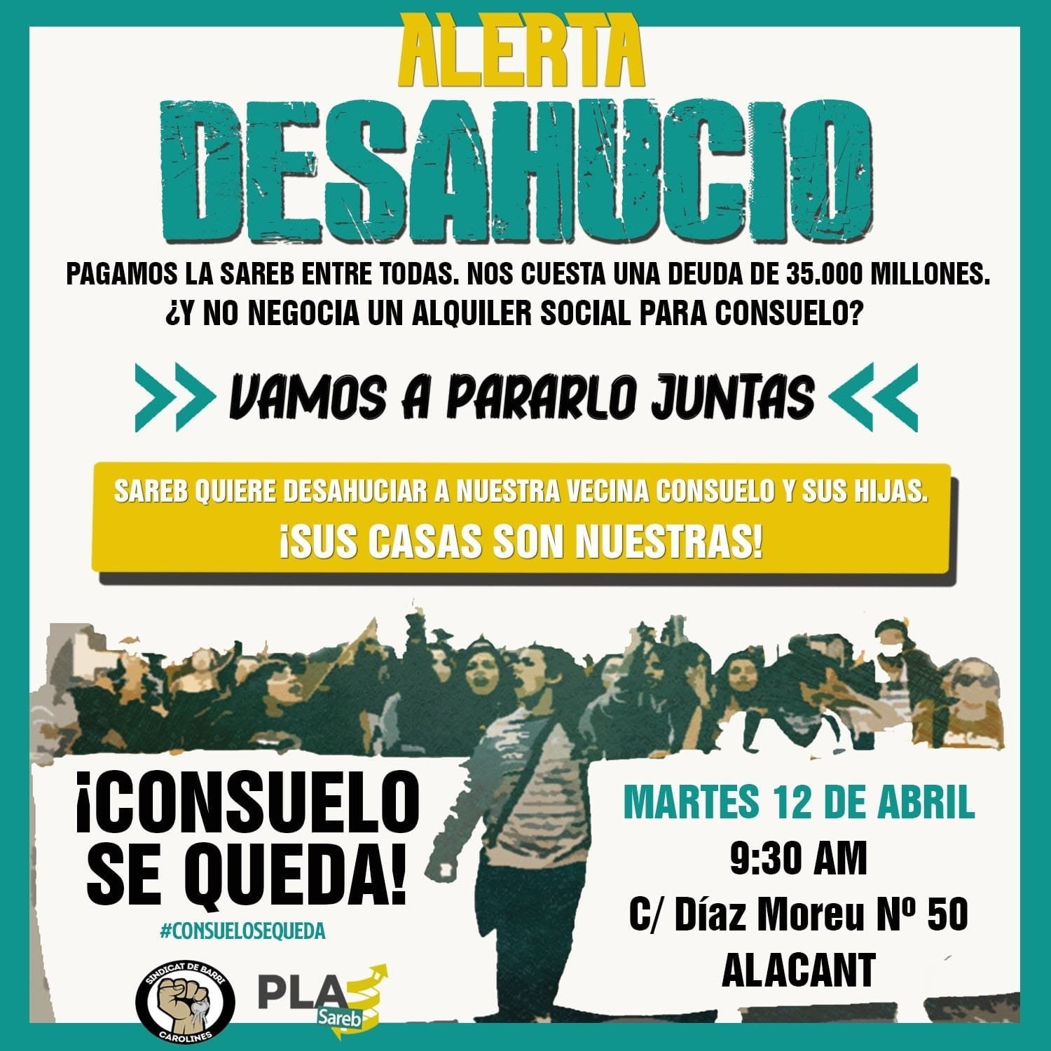 Segons denuncia el sindicat esmentat, «la SAREB no està concedint lloguers socials a les persones en situació de vulnerabilitat que habiten en els habitatges de la seua propietat. Davant aquest fet i la situació de falta d’alternativa residencial (quasi inexistent parc d’habitatge públic i amb llistes d’espera col·lapsades i situació de bombolla en els preus de pisos en lloguer, no adaptats a la situació d’inflació i crisi en augment), la SAREB condemna Consuelo i la seua família a viure al carrer. La responsabilitat última d’aquesta situació és del govern, que a través del FROB ha rescatat dues vegades el deute del banc dolent, estant hui dia ja sota el seu control majoritari, i continua deixant a famílies senceres sense sostre».