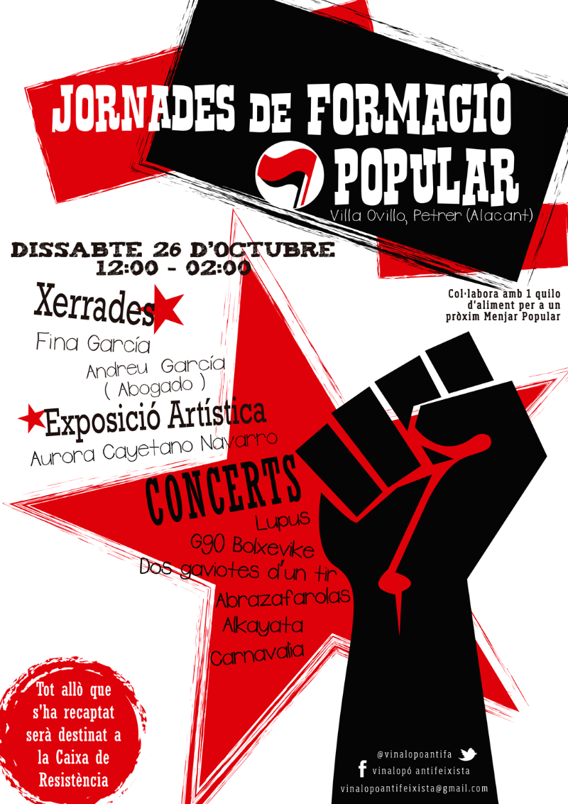La coordinadora Vinalopó Antifeixista, que té presència a la comarca de les Valls del Vinalopó i Alacant celebra aquest dissabte 26 d’octubre les ‘I Jornades de Formació Popular’ a Petrer (Valls del Vinalopó) amb xerrades, música i art.