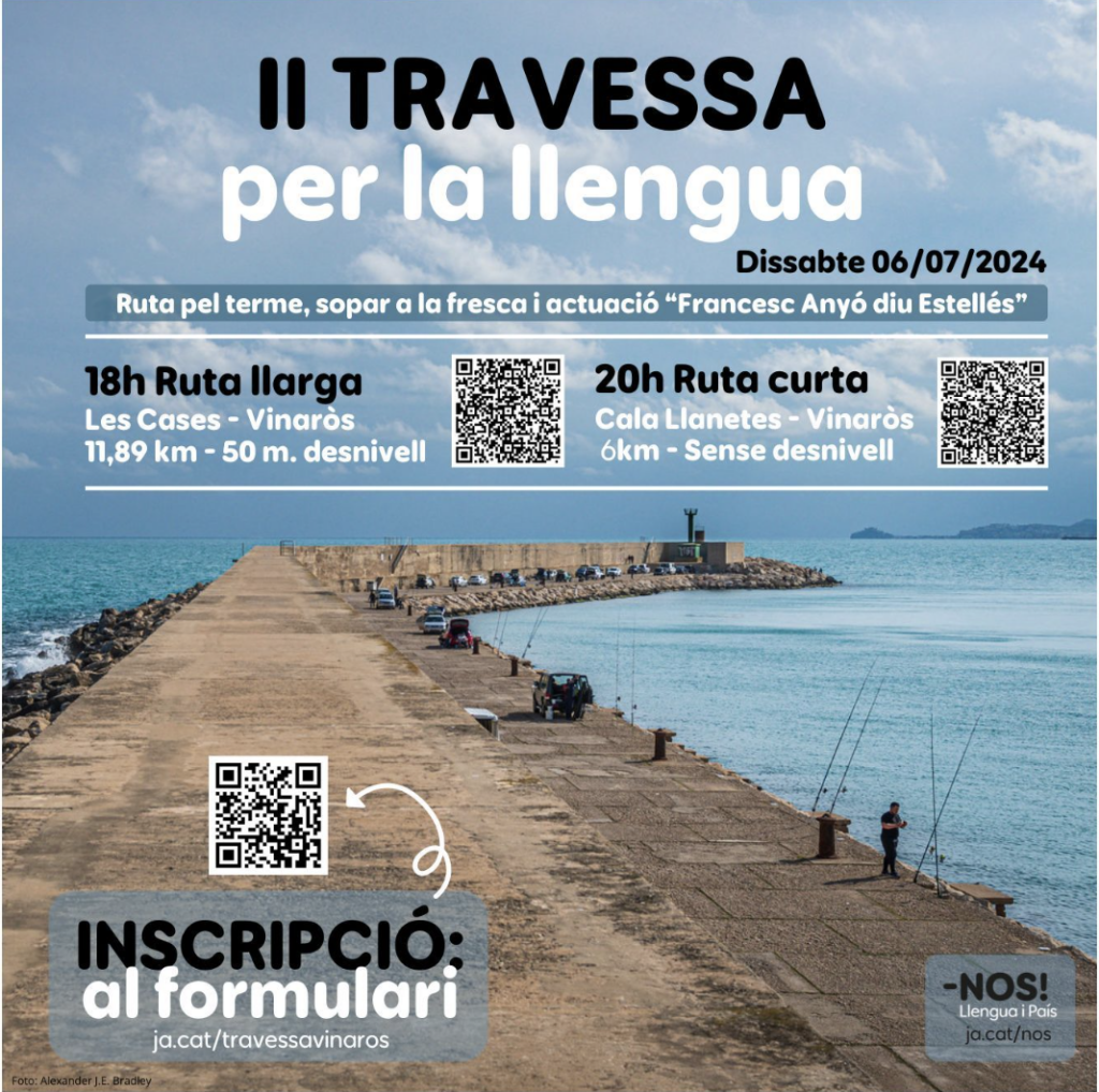 La segona «Travessa per la llengua», convocada per la confluència -NOS! Llengua i país aquest dissabte, 6 de juliol, tindrà lloc entre les Cases d’Alcanar (el Montsià) i Vinaròs (el Maestrat) per a subratllar que «el Sénia ni és frontera».