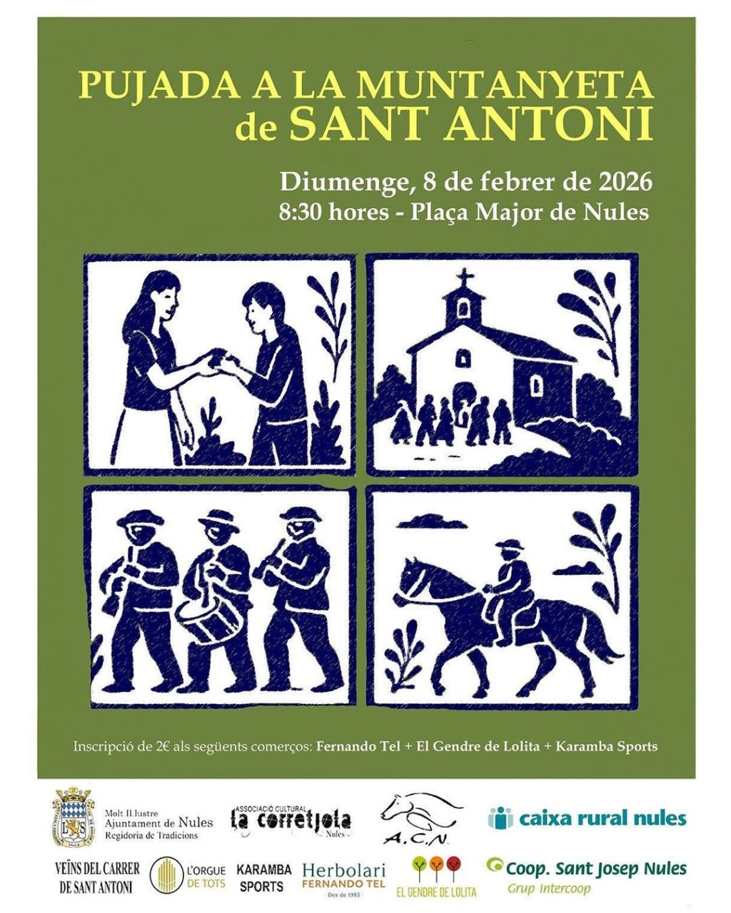Nombroses persones tornaran a aplegar-se a Nules (la Plana Baixa) aquest diumenge, 8 de febrer, per a dirigir-se a peu a la Muntanyeta de Sant Antoni de Betxí, una tradició que es va perdre en la dècada del 1960 i que es va recuperar el 2023, gràcies a l’Associació Cultural la Corretjola amb la col·laboració de l’Associació Amics del Cavall del municipi. La caminada també compta amb el patrocini i suport de la regidoria de Tradicions de l’Ajuntament de Nules, la Caixa Rural i la Cooperativa Agrícola de Nules.