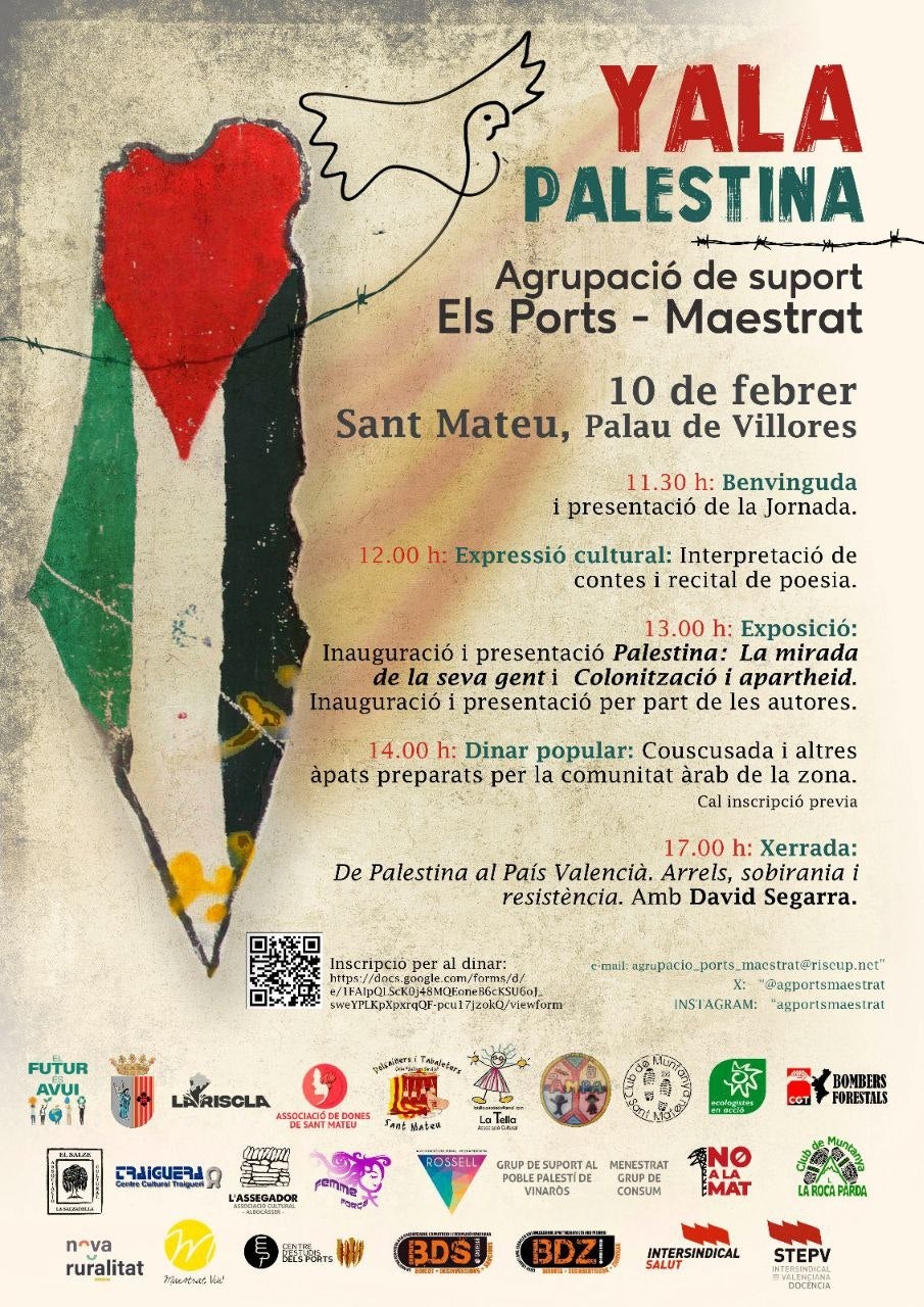 «Yala Palestina», Agrupació de suport els Ports – Maestrat, ha organitzat una jornada de solidaritat internacionalista amb Palestina al Palau de Villores de Sant Mateu aquest dissabte, 10 de febrer. La proposta, nascuda de la gent d’aquestes comarques, pretén ser itinerant i arribar als pobles interessats a dur a terme aquesta acció de suport amb Palestina.
