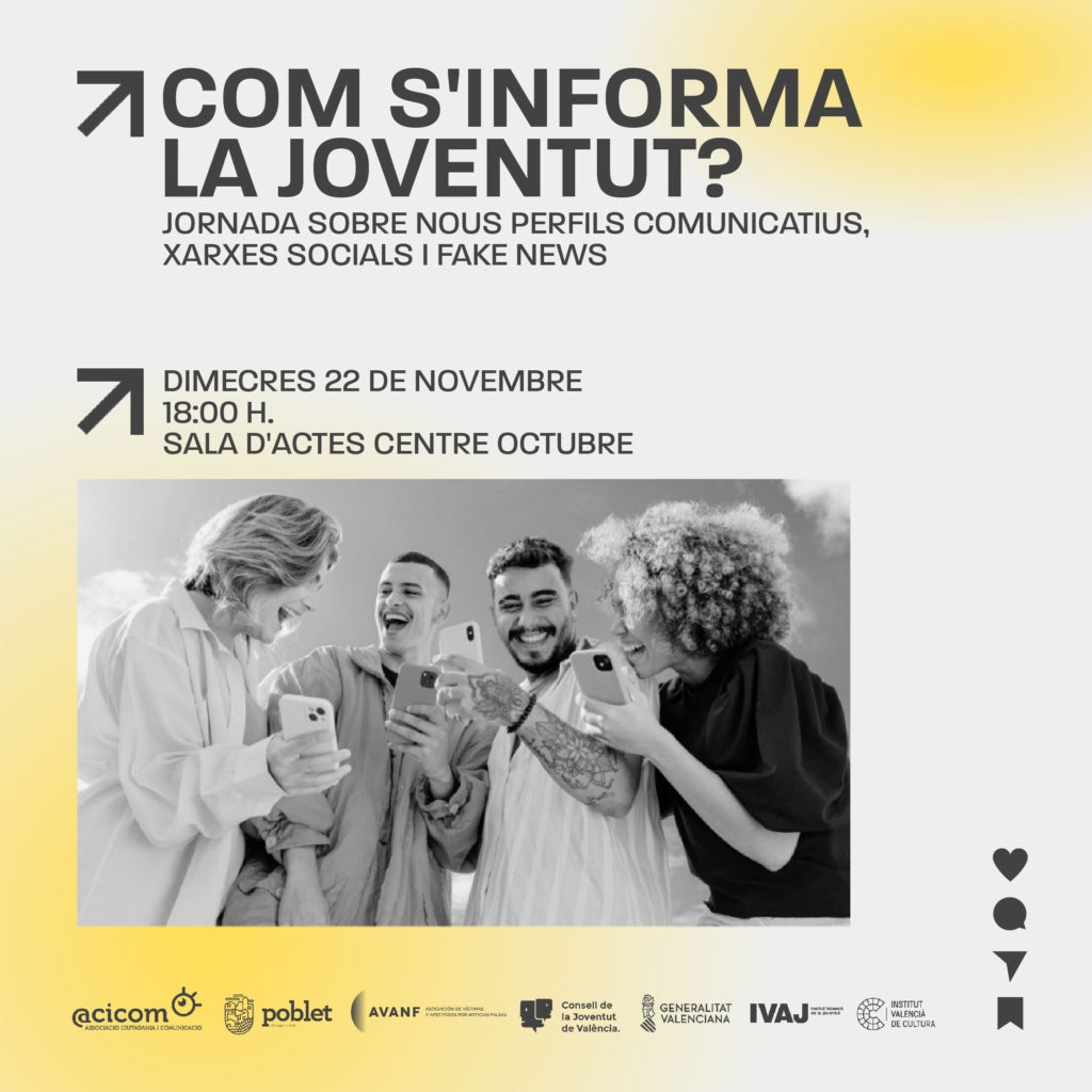 En el primer col·loqui, que moderarà el president d’ACICOM, Juan Medina, hi participaran Josan Piqueres, periodista de Diari La Veu; Joan Asensi Pastor, estudiant del Grau en Periodisme a l’UJI; Àngels Cuenca Adam, cap del Servei d’Informació Juvenil i de la Xarxa Jove de l’IVAJ; Anna Verge, periodista del web d’À Punt; Carlos Manzana, tècnic de Comunicació del CJV, i Manolo Rodriguez, professor de Sociologia a la Universitat de València i president de l’AVANF (Associació d’Afectats i Víctimes de notícies Falses).