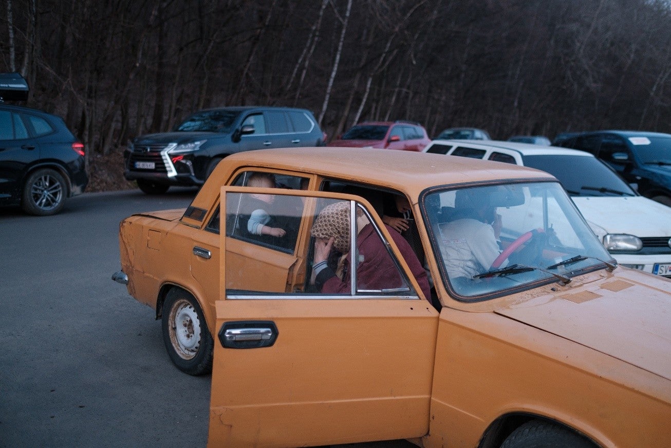 Fa quatre dies que som a la ciutat d’Uzhgorod: contactant amb gent, amb la xarxa de Voluntaris de Transcarpatia, amb reclutament, anant a les estacions de tren per a veure com arriben les persones que han hagut de ser evacuades… En definitiva, trobes història de tota mena. Resulta que volíem travessar la frontera i ens havíem fet la motxilla per a un dia; tardàrem molt més temps del previst. És per això que ens quedàrem a Ucraïna quatre o cinc dies amb la mateixa roba. Quan ens disposàvem a eixir del país, hi havia una cua bastant llarga i molta presència policial, ja que hi hagué una fallada elèctrica. No hi havia llum i no funcionaven els ordinadors, per la qual cosa no podien revisar-nos els passaports i no ens hi deixaven sortir. Ens van dir que hi havia un pas fronterer a una hora, la qual cosa no ens va fer gràcia, però ens hi desplaçàrem mitjançant un taxi; tota la gent que volia eixir d’Ucraïna era en aquell lloc. Recorde que el taxista es va detindre en una cua de cotxes d’uns tres-cents metres, malgrat que això no és res fins a la frontera amb Polònia; havia sentit que allí les cues arribaven a ser quilomètriques. Recorde que hi havia un cotxe tipus soviètic i d’altres de luxe esperant per travessar la frontera. Et trobes amb gent eixint amb cotxes molt cars. No obstant això, em va cridar l’atenció topetar amb una família molt humil en el seu vehicle. Es tractava d’una família rural que segurament no hauria eixit mai d’Ucraïna, mentre que la resta semblava que es trobaven de viatge. Pareixia una foto de Sarajevo. En aquest cotxe hi havia un total de cinc persones, totes elles amuntonades. Em quedaria amb eixa foto.