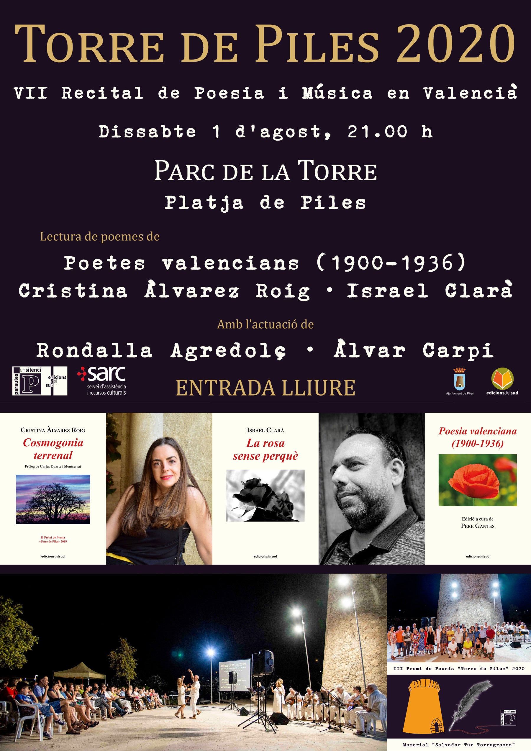 El parc de la Torre de Piles acull el dissabte 1 d’agost, a partir de les 21 h, el VII Recital de Poesia i Música en Valencià, que organitzen l’editorial saforenca Edicions del Sud i l’Ajuntament de Piles. L’acte d’enguany serà el primer que retrà homenatge al piler Salvador Tur Torregrossa, qui va participar en el recital des de la seua fundació i qui va faltar a l’agost de 2019, tot just la mateixa vespra de la celebració de la sisena edició. Tal com s’ha fet en les dues convocatòries anteriors, la nit del dissabte 1 d’agost servirà per a donar a conéixer el nom de la persona guanyadora del III Premi de Poesia «Torre de Piles» 2020 i el títol de l’obra que serà publicada en la col·lecció «Paraules en silenci» d’Edicions del Sud. En la present edició, recitadors i recitadores de diferents punts de la geografia valenciana llegiran poemes de l’antologia Poesia valenciana (1900-1936) i dels poemaris Cosmogonia terrenal, de Cristina Àlvarez Roig, i La rosa sense perquè, d’Israel Clarà. La part musical serà a càrrec de la Rondalla Agredolç, que obrirà i tancarà l’espectacle, i del cantautor d’Algemesí, Àlvar Carpi.