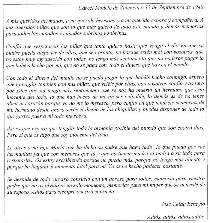 Al sendemà, un nebot de Celda, des de dalt d’una garrofera, va vore la imatge tràgica de com mataven l’oncle José i dues dotzenes més de presos joves en el mur del Terrer. La metralla es va deixar oir fins a les fàbriques de jute de Vinalesa i Foios, on treballava tota la jovenalla de l’horta.