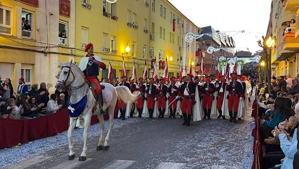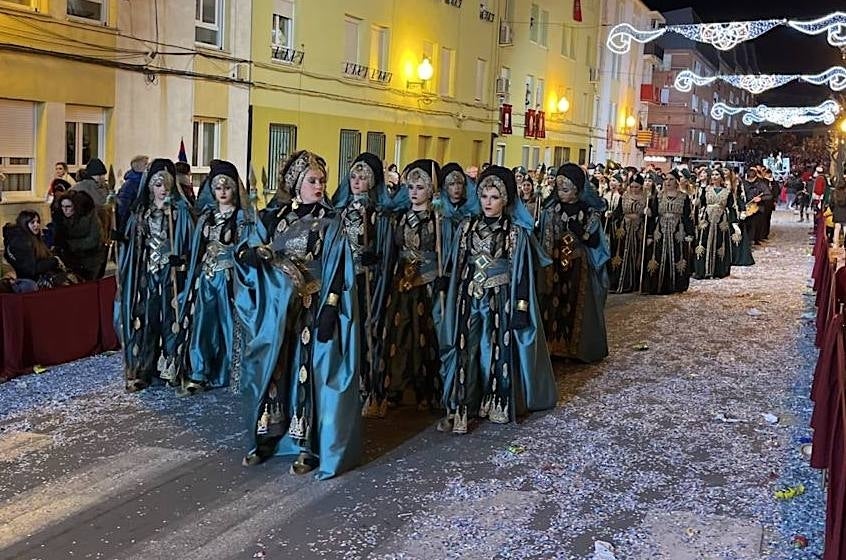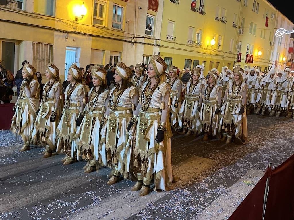 Assenyala Albert Alcaraz que, al segle XVIII, quan es va iniciar la festa, «la presència de la Soldadesca, agrupació de festers en companyies amb dret a utilitzar pólvora i armes de foc durant el desenvolupament de les processons, ja era habitual». I continua: «La Companyia de Soldats de la Vila, estructurada en arcabussers, piquers i mosqueters, va protagonitzar al llarg de tot el segle els esmentats actes festius. Am la pèrdua dels Furs, el 1707, la Soldadesca va ser abolida pel Felip V […] A la darreria del 1859, el Consell General de la Vila va votar a favor de la celebració de festes de Moros i Cristians. Aleshores, la Soldadesca va haver de transformar-se, les companyies s’organitzaren en bàndols oposats i la festa va adquirir la fisonomia actual».