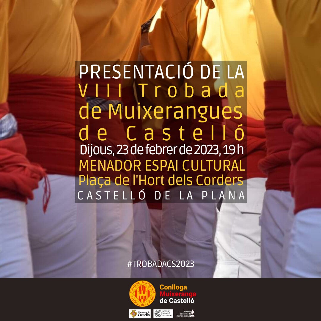 En l’acte, s’hi donaran a conéixer les tres colles participants en la jornada, el disseny del cartell, l’entitat o persona Conlloguera 2023, el concurs de Fotografia VIII Trobada de Muixerangues de Castelló (a través d’Instagram), les més de trenta entitats i empreses col·laboradores i el vídeo de promoció de la trobada.