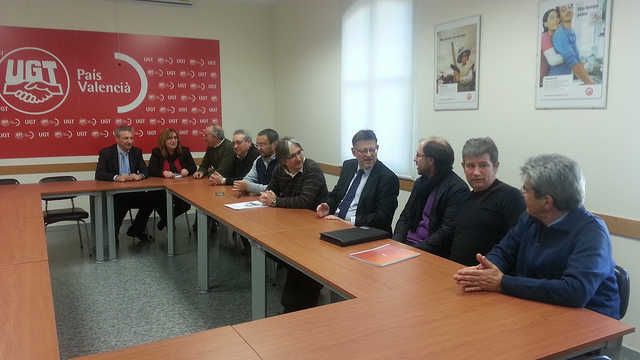 Puig i altres membres de l’executiva socialista s’han reunit amb la direcció d’UGT-PV encapçalada pel secretari general d’UGT, Conrado Herández, en la seu del sindicat per analitzar la situació de l’ocupació al País Valencià.