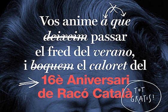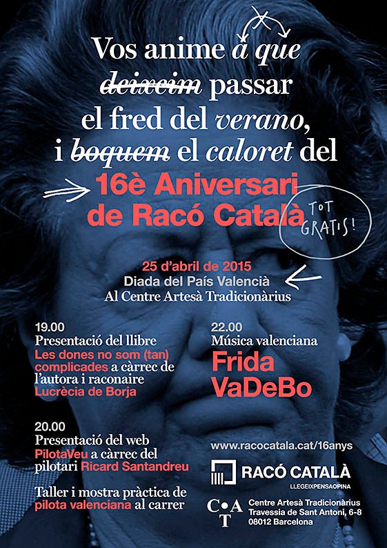 El passat mes de març el portal Racó Català va fer setze anys i com ja és habitual en els seus aniversaris, ha preparat una festa per celebrar-ho. Enguany, la celebració coincidirà amb la Diada del País Valencià, el 25 d’abril, i per això la jornada tindrà un caire valencià [vegeu el cartell complet clicant la imatge].