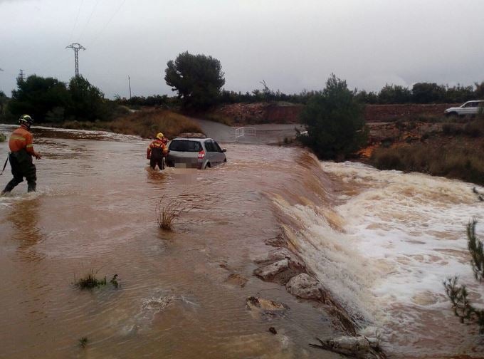 La dona es trobava enmig del riu i els bombers li han llançat una corda perquè no fóra arrossegada pel corrent mentre aconseguien accedir al lloc, ja que la situació climatològica és complicada a causa del temporal de pluja i vent que afecta el País Valencià.