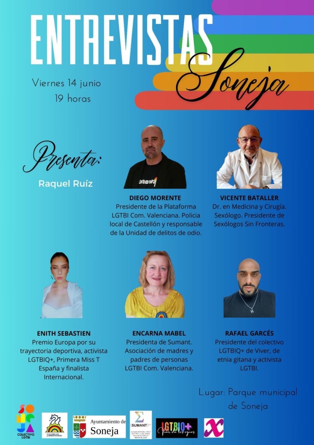 La primera jornada començarà a les 19 hores amb una taula redona i diferents entrevistes al Parc Municipal. En aquest espai de diàleg, hi participaran destacats representants del col·lectiu: Diego Morente, president de la Plataforma LGTBI de la Comunitat Valenciana; Vicente Bataller, doctor en medicina i cirurgia i sexòleg; Enith Sebastien, primera Miss T a Espanya; Encarnen Mabel, presidenta de l’Associació de Mares i Pares de LGTB+ Sumant, i Rafael Garcés, president del col·lectiu LGTBIQ+ de Viver.