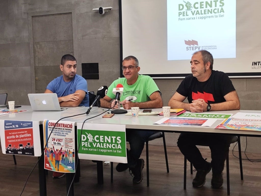 Així ho ha donat a conèixer aquest dijous en roda de premsa el coordinador d’Acció Sindical de STEPV, Marc Candela, amb el secretari nacional del sindicat, Lluís Navarro, i amb el coordinador d’Acció Sindical del Sindicat de Treballadors de l’Administració, Rubén Moreno. Cap dels tres no descarta una vaga general en el sector de l’educació «si la cosa continua així».