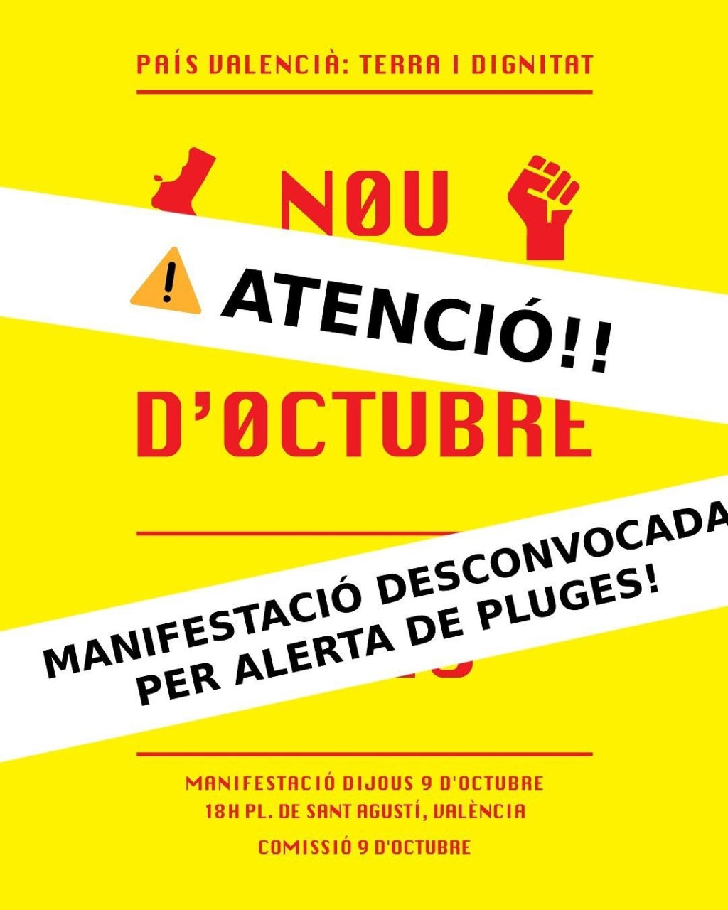 El moviment cívic —format per Acció Cultural del País Valencià (ACPV), ACV Tirant lo Blanc, Bloc de l’Estudiantat Agermanat (BEA), Ca Revolta, CCOO-PV, Compromís, Decidim, Intersindical Valenciana, Esquerra Republicana del País Valencià (ERPV), Esquerra Unida del País Valencià (EUPV), Escola Valenciana, la Plataforma per la Llengua, Podem i la Societat Coral el Micalet— subratlla que l’anul·lació respon exclusivament a criteris de prevenció i prudència davant la previsió adversa. “S’ha decidit suspendre la manifestació prevista per al 9 d’Octubre”, indiquen, tot remarcant que la mesura s’ha acordat després d’“avaluar les informacions oficials de l’AEMET”.