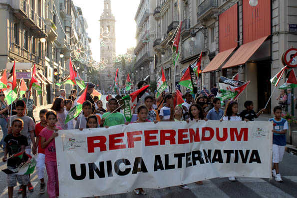 Les famílies que han acollit xiquets saharians en la campanya ‘Vacances en pau’, i les associacions de solidaritat amb el poble saharià, van fer ahir dissabte la tradicional trobada i manifestació des de la plaça del Patriarca de València fins al riu, prop del pont de les flors.