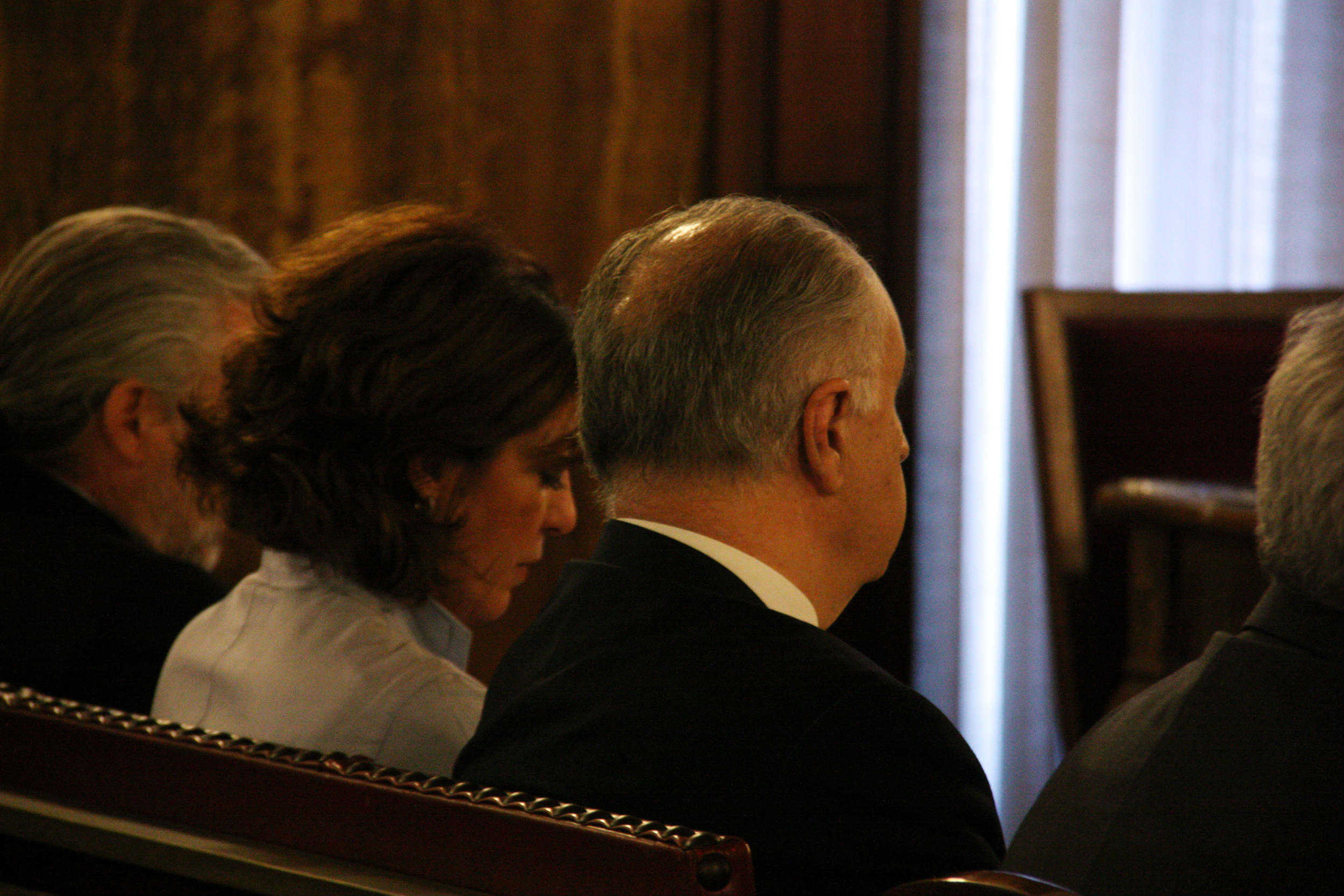 A poc a poc, amb un marge minuciós de cinc minuts, arriben la resta d’acusats. A les 9:05, Marc Llinares, amb una motxilla roja a l’esquena propulsada amb passes curtes i ràpides de batxiller fent tard a classe. I a les 9.10, Alexandre Català, mirada gran i fonda d’animal de peixera. O Tina Sanjuán, la secretària discreta i perenne de Blasco, que aprofita un clivell entre els gràfics per esquivar el retrat. Un fet inevitable per a Marcial López i el seu advocat. Dos gotes d’aigua de pel canós, faccions d’escaiola i gavardina fins als turmells que es fonen a l’escala ruixada de penombra. La mateixa que acull les figures endolades de Josep Maria Felip amb la filla del braç.